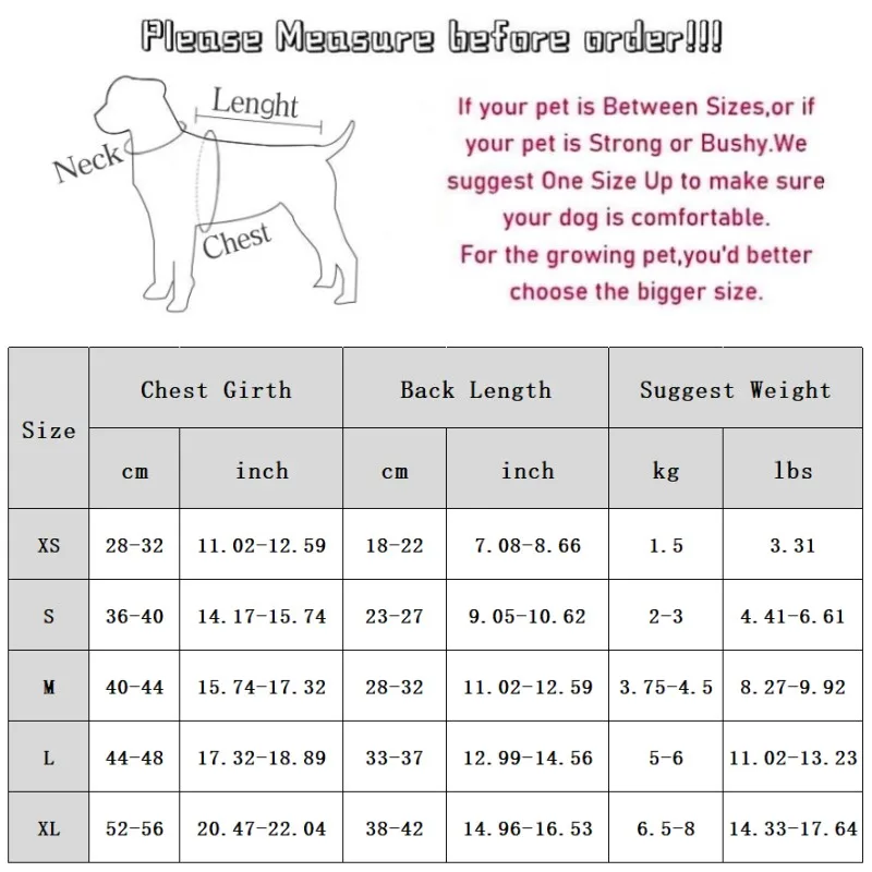 XS: Pecho 28-32 cm/11,02-12.59 ''; Longitud 18-22 cm/7,08-8,66''; Peso sugerido 1,5 kg/3,31 lbs.