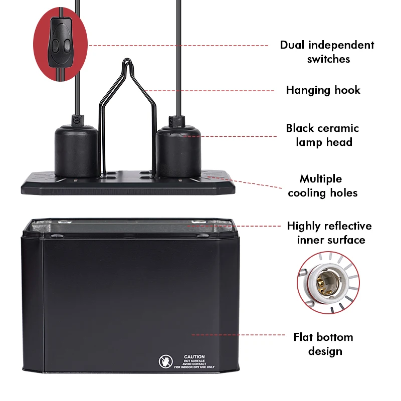 1.Pantalla de doble cabezal: se utilizan luces dobles al mismo tiempo, pantalla de lámpara integrada, cada cabezal de lámpara está equipado con un interruptor de control separado para un uso fácil, luz concentradora y resistencia al calor para satisfacer las necesidades de iluminación diarias de las mascotas.