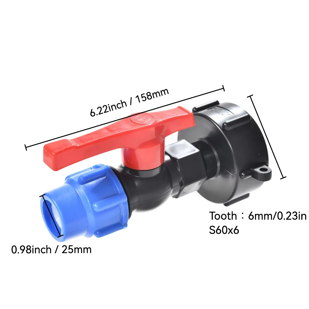 Esto Adaptador de tanque de agua IBCestá diseñado para el estándar Tanques de mano IBC de 264Gal (1000L)con un Rosca de salida S60x6.Convierte la salida del tanque en un Conector de manguera de 25 mm o 32 mm, con un válvula de conexión rápidapara un fácil control del flujo de agua.Hecho de plástico duradero, es perfecto para recolección de agua de lluvia al aire libre, riego de jardines y conexiones de tuberías de PE.