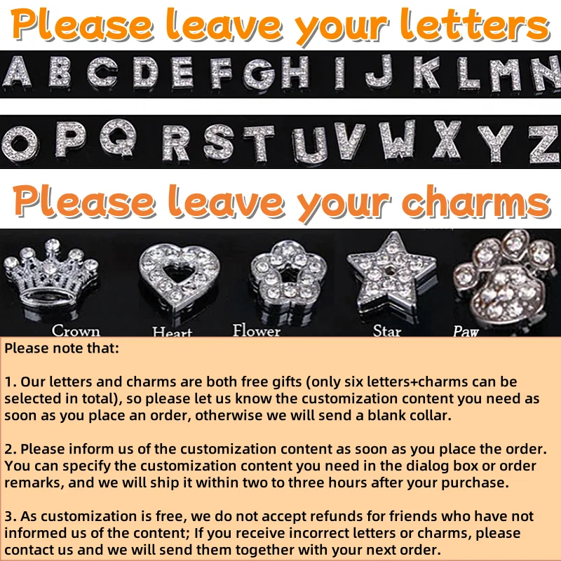 1.Nuestras letras y dijes son obsequios (solo se pueden seleccionar seis letras + dijes en total), así que háganos saber el contenido de personalización que necesita tan pronto como realice un pedido; de lo contrario, le enviaremos un collar en blanco.