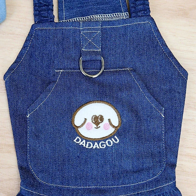 Adorable y cómodo vestido para perros con estampado vaquero, diseño de cabeza de cachorro, ropa ligera para mascotas en azul claro y azul oscuro para perros