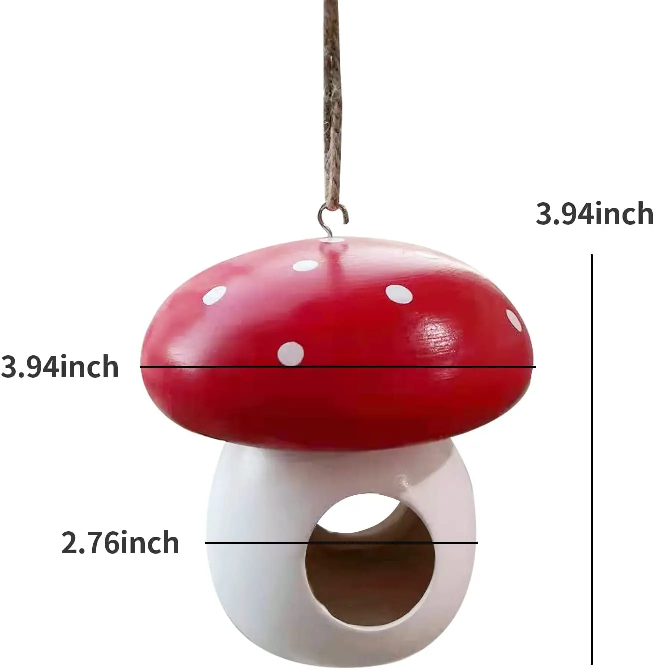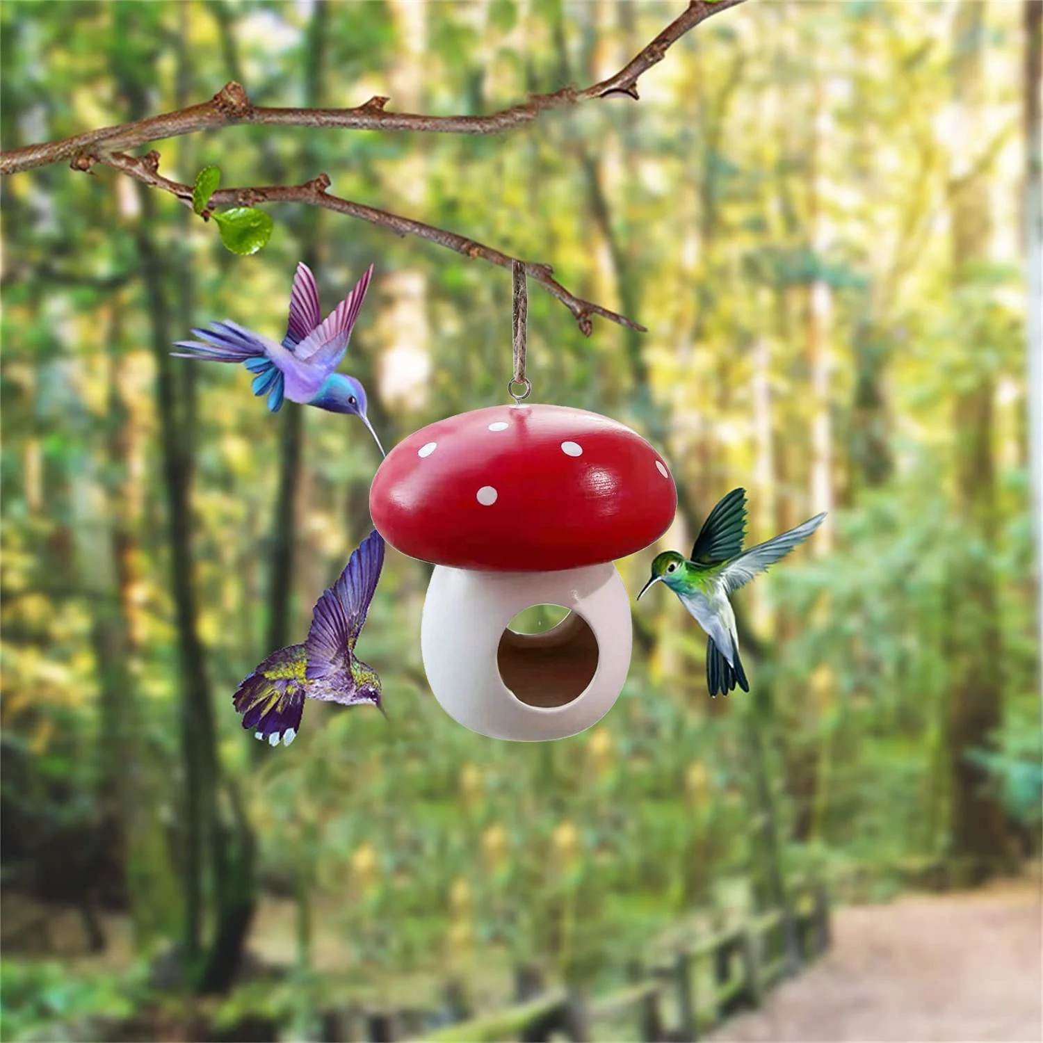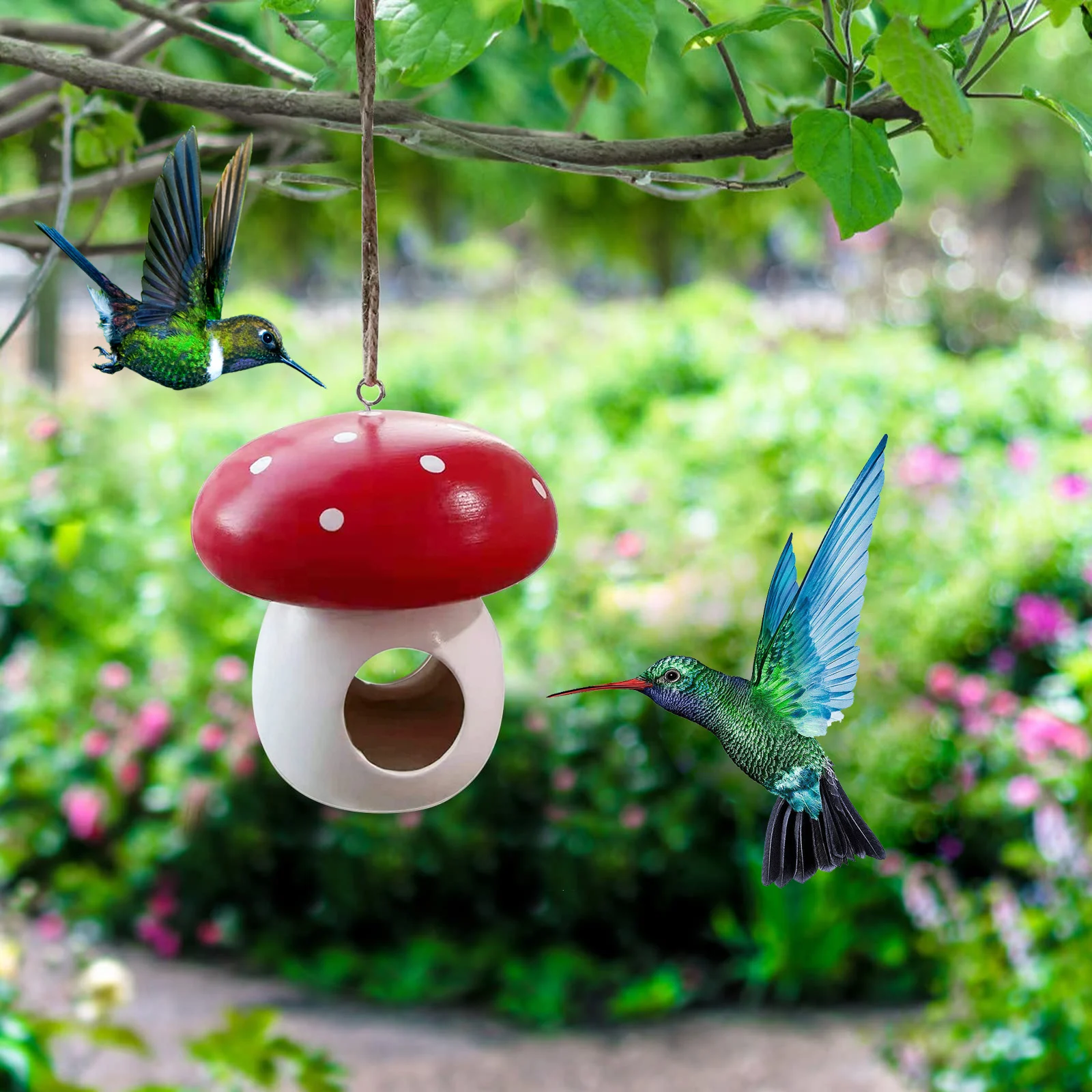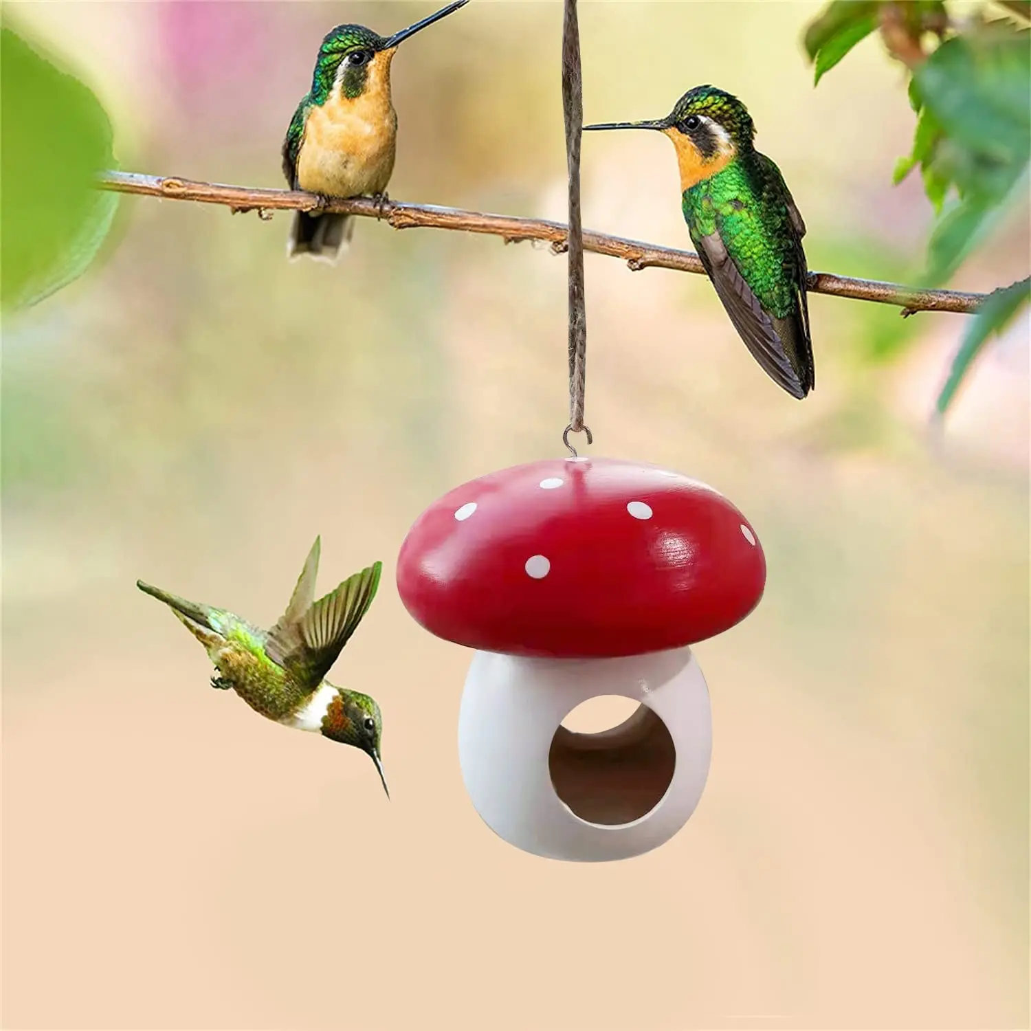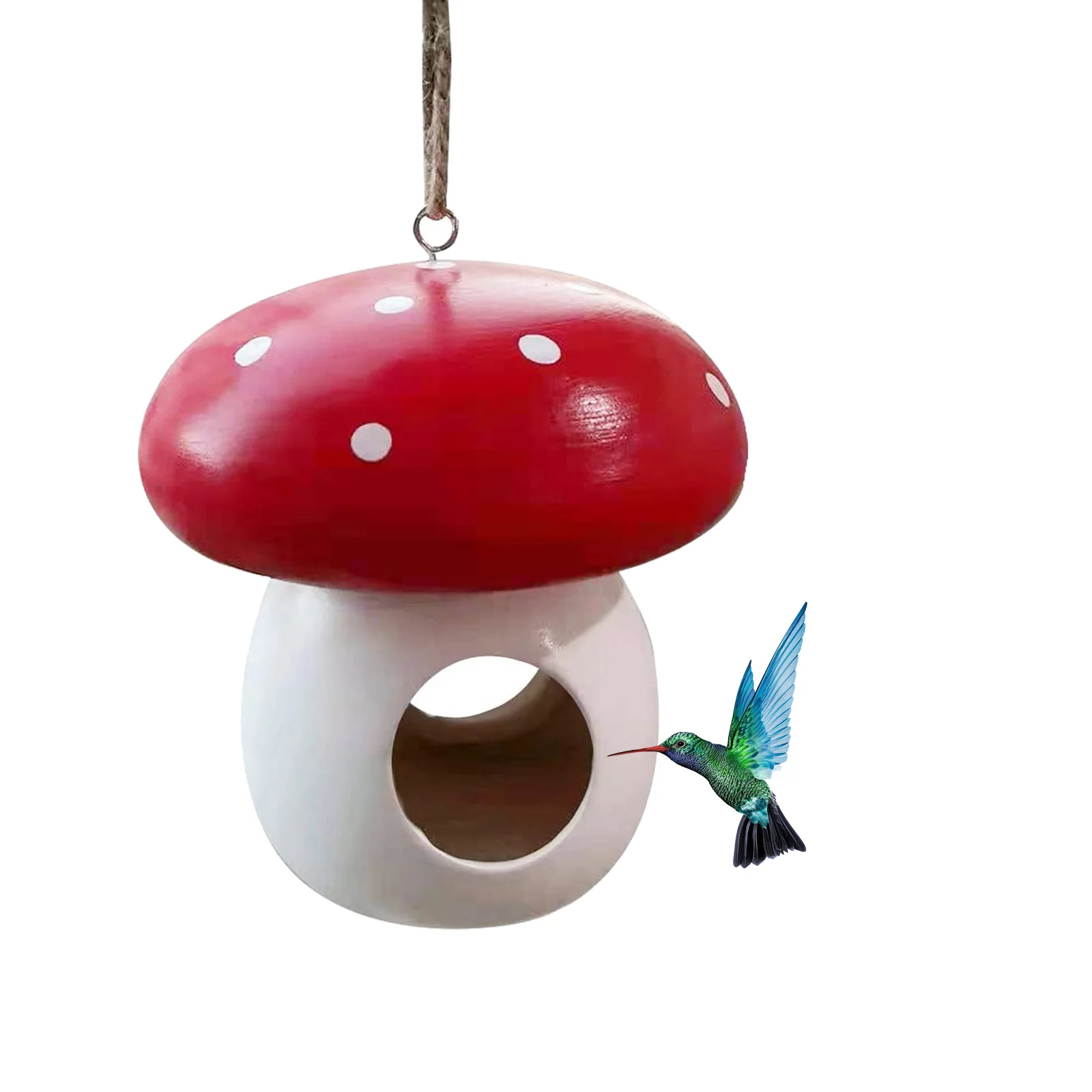 La decoración del alimentador de hongos está pintada en colores rojo y blanco brillante para atraer la atención de pájaros como los colibríes.