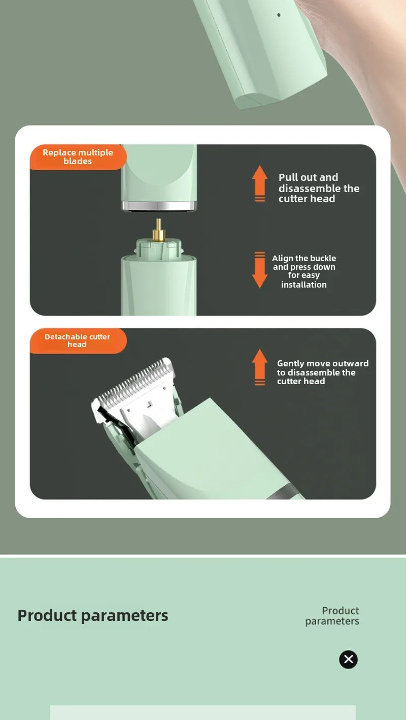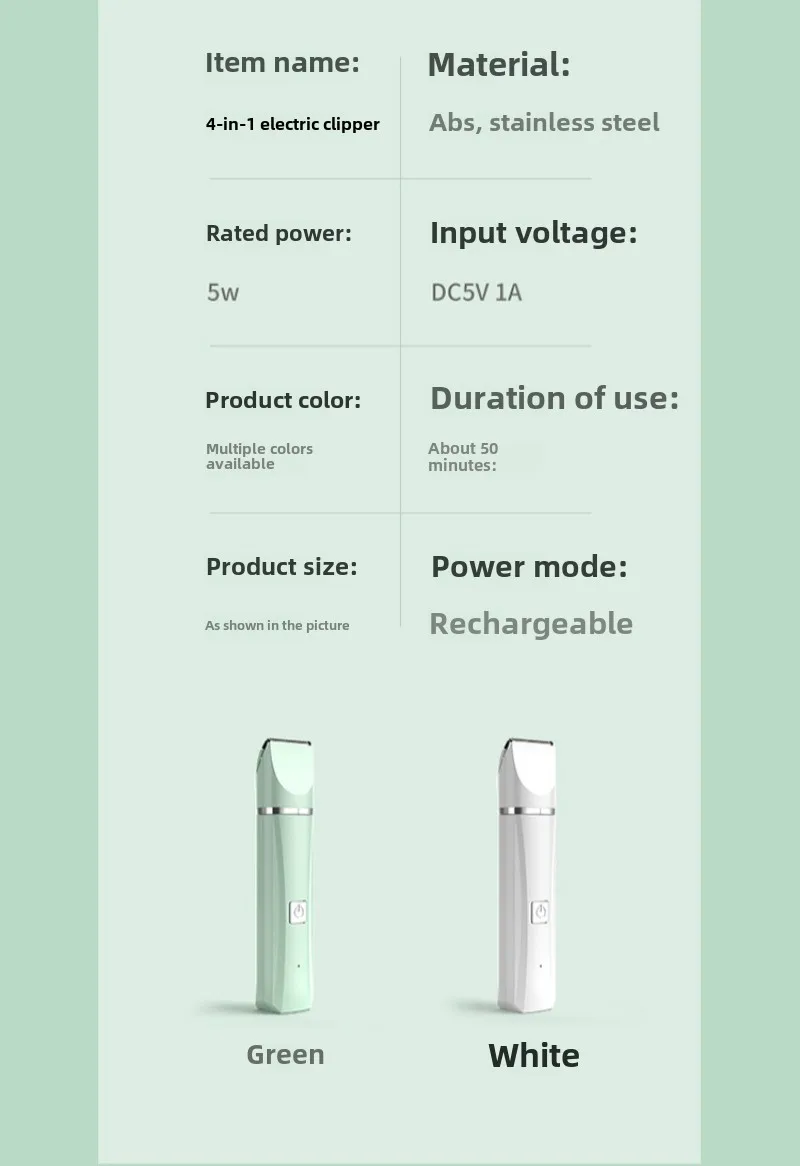 Descripción: Afeitadora para mascotas, depilación de perros y gatos, tijera eléctrica de empuje, artefacto de afeitado de pies cuatro en uno para mascotas Instrucciones de uso: 1.Compruebe si el producto está en buenas condiciones antes de usarlo. 2.Lávelo y manténgalo correctamente después de su uso. 3.Debido a los diferentes lotes de producción, los detalles del producto pueden variar. 4.Si le importa la diferencia de precio, compre con precaución.