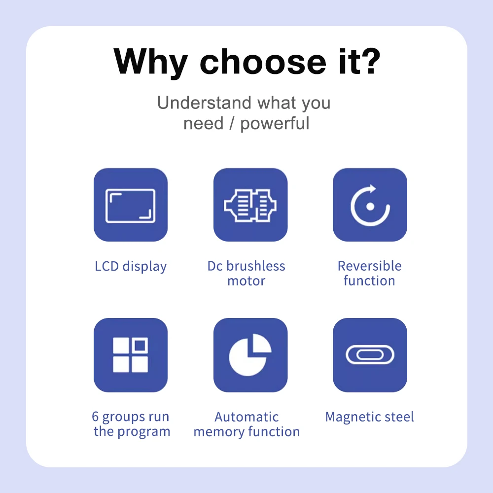 1.Pantalla LCD, velocidad ajustable, tiempo y otros parámetros, intuitiva y clara;