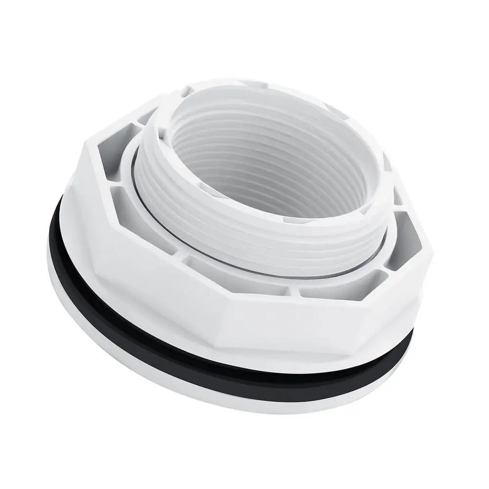Las juntas y una tuerca de ajuste permiten que se una y se selle a través de la pared de la piscina y el revestimiento de vinilo. El frente tiene roscas hembra de 1 a 1/2 pulgadas para usar con el ajuste del globo ocular. La parte posterior tiene hilos hembra de 1-1/2 pulgadas para usar con un accesorio de manguera.