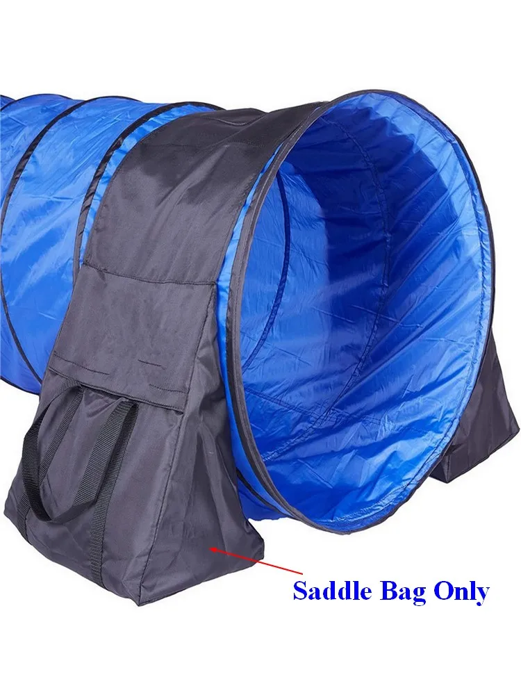 40cm (16") WIDE, left+right part, joined in the middle with strong commercial grade Velcro, the saddlebags are adjustable to accommodate agility tunnel diameter upto 24” .