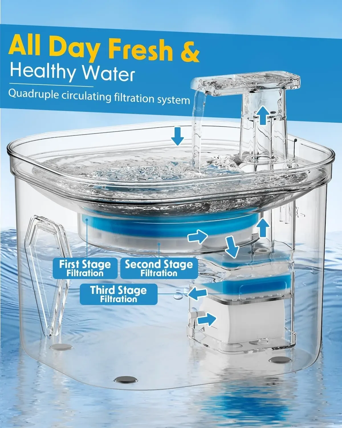 No escatimamos esfuerzos centrándonos en la salud de sus mascotas.Equipada con 10 capas de filtros, nuestra fuente de agua para gatos en el interior puede eliminar las impurezas del agua de manera efectiva, proporcionando agua potable ultra limpia para sus mascotas.