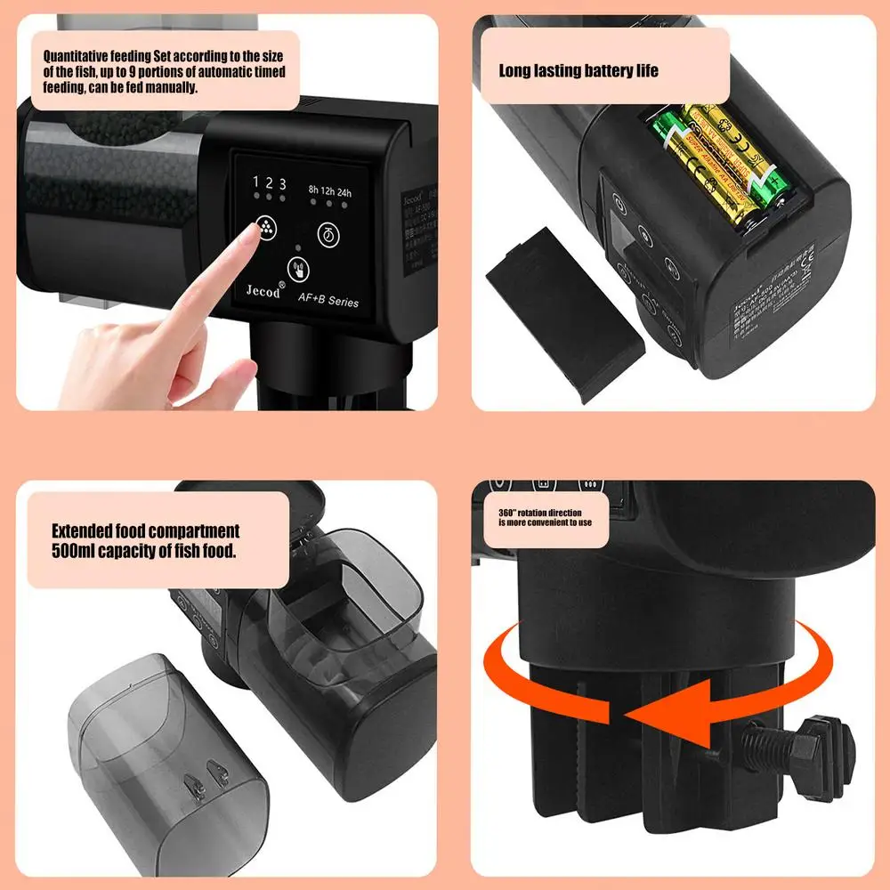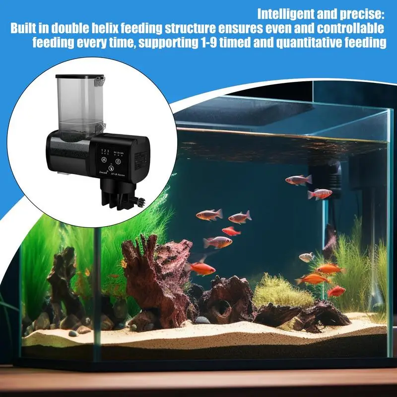 1. Control de alimentación inteligente: garantiza una baja tasa de error de dosificación, con un mecanismo de alimentación preciso que se adapta a varios tipos de alimentos para peces y admite tiempos programables para tomas diarias de 1 a 9 grados, para optimizar las rutinas de cuidado del acuario.