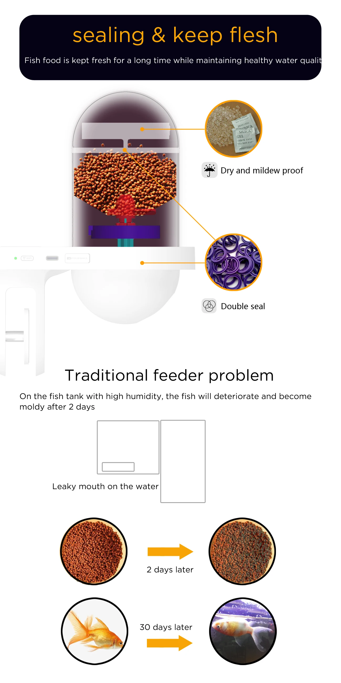 Diseño inteligente a prueba de humedad: el contenedor de comida para peces de gran capacidad de 230 ml tiene una tapa para colocar desecante.Su excelente efecto a prueba de humedad garantiza que la comida para peces en la caja de almacenamiento esté seca y fresca.Diseño de sellado, la comida del interior no se apelmaza y no bloquea el puerto de alimentación.