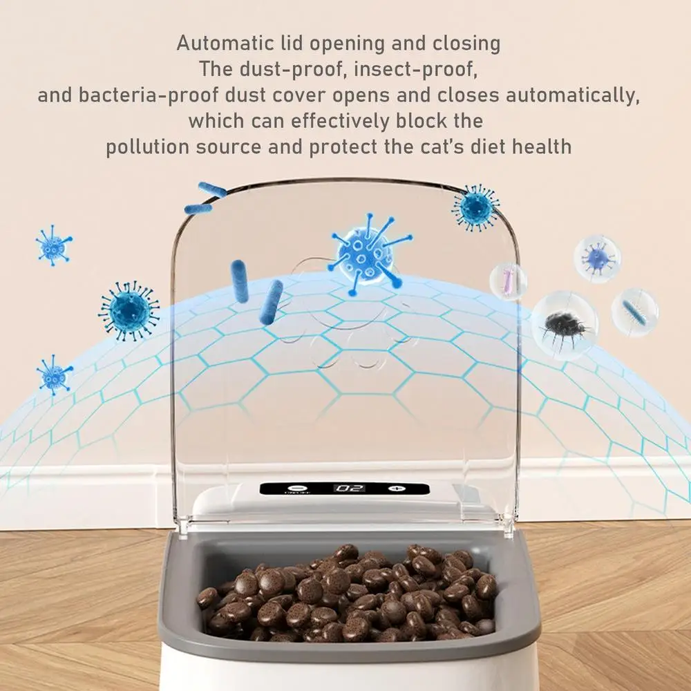 4. Evite la exposición al aire: nuestro comedero automático para gatos tiene una innovadora función de apertura de la tapa que evita que los alimentos queden expuestos al aire y se humedezcan.Esto asegura que las comidas de su gato permanezcan deliciosas y bien mantenidas, haciendo que la hora de comer sea un placer.