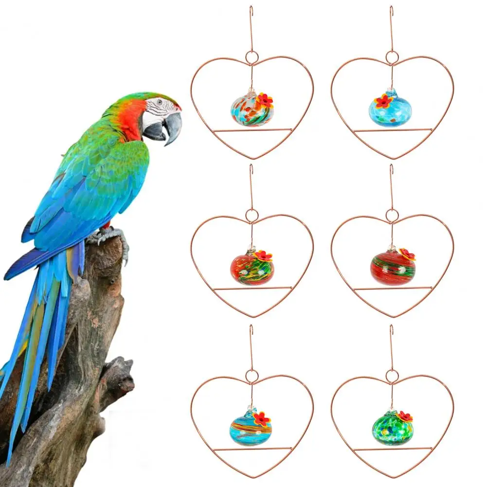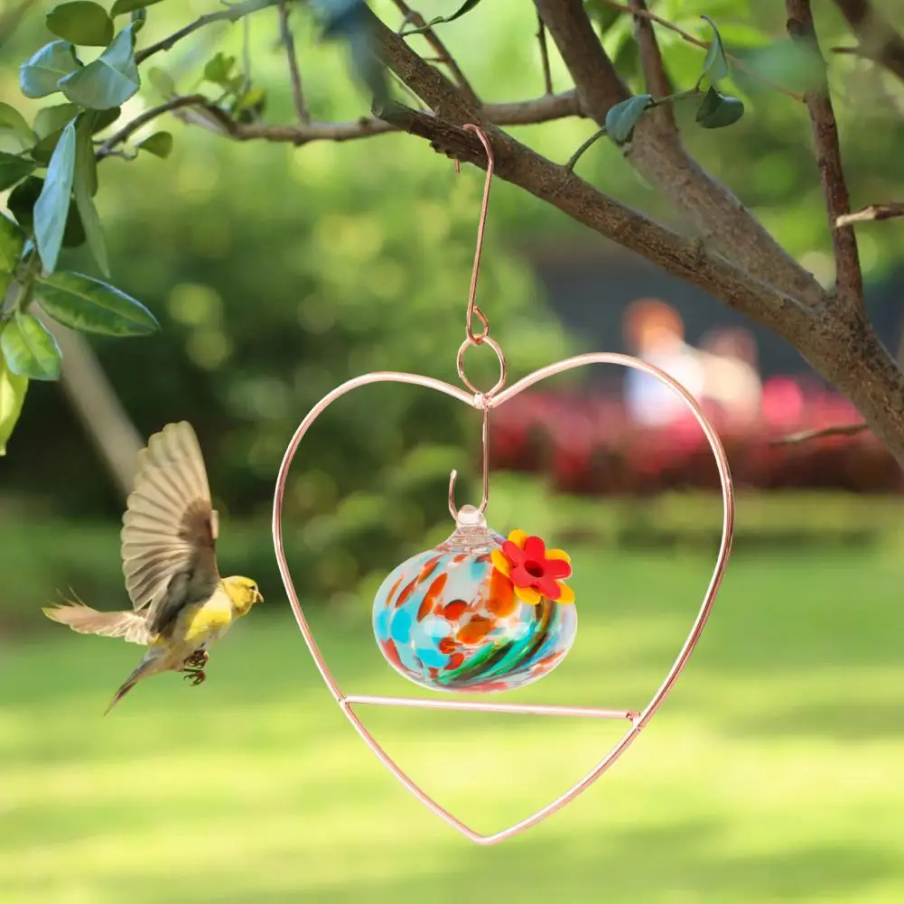 Alimentador de colibrí en forma de corazón, alimentador de agua colgante con percha, botella de vidrio colorida, marco de alambre, alimentador de colibrí para porche, patio, jardín al aire libre