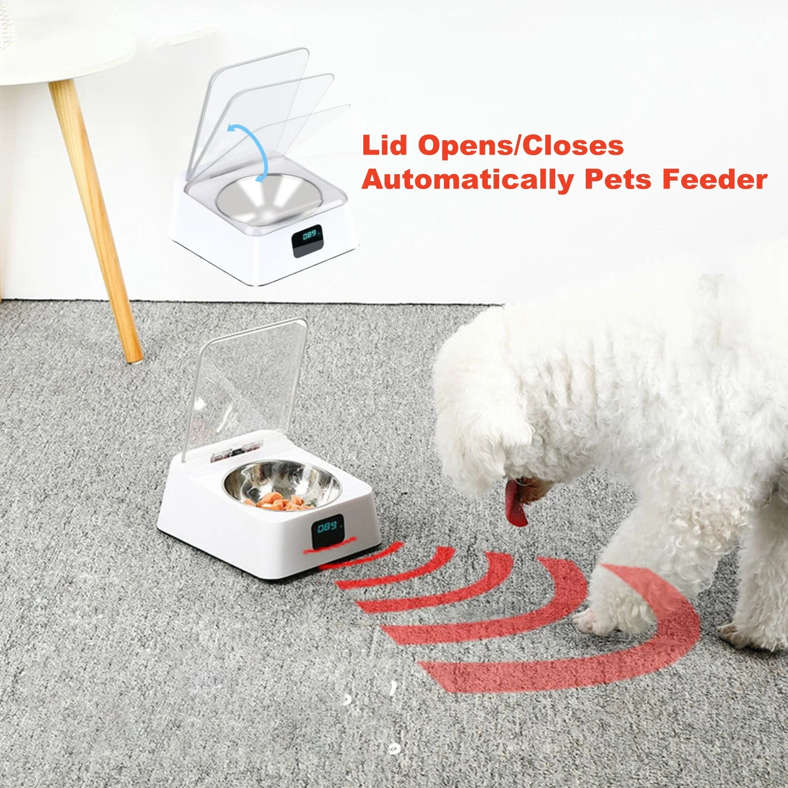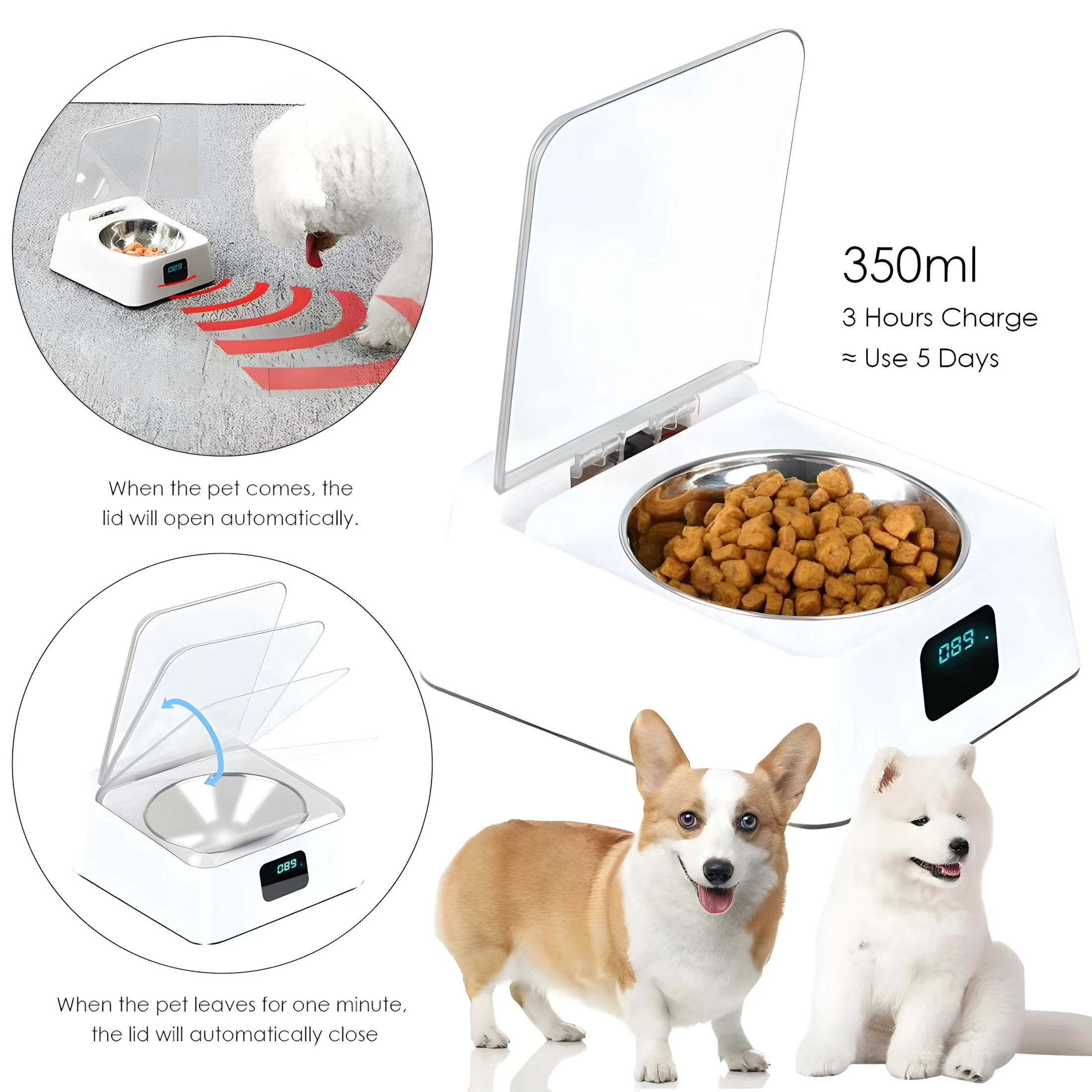 【Características de detección】: Recipiente de alimentación inteligente para mascotas, cuando la mascota ingresa al rango de detección, la tapa del recipiente se abre automáticamente, se abre permanentemente dentro del rango de detección y se cierra automáticamente dentro de 1 minuto después de que se va.
