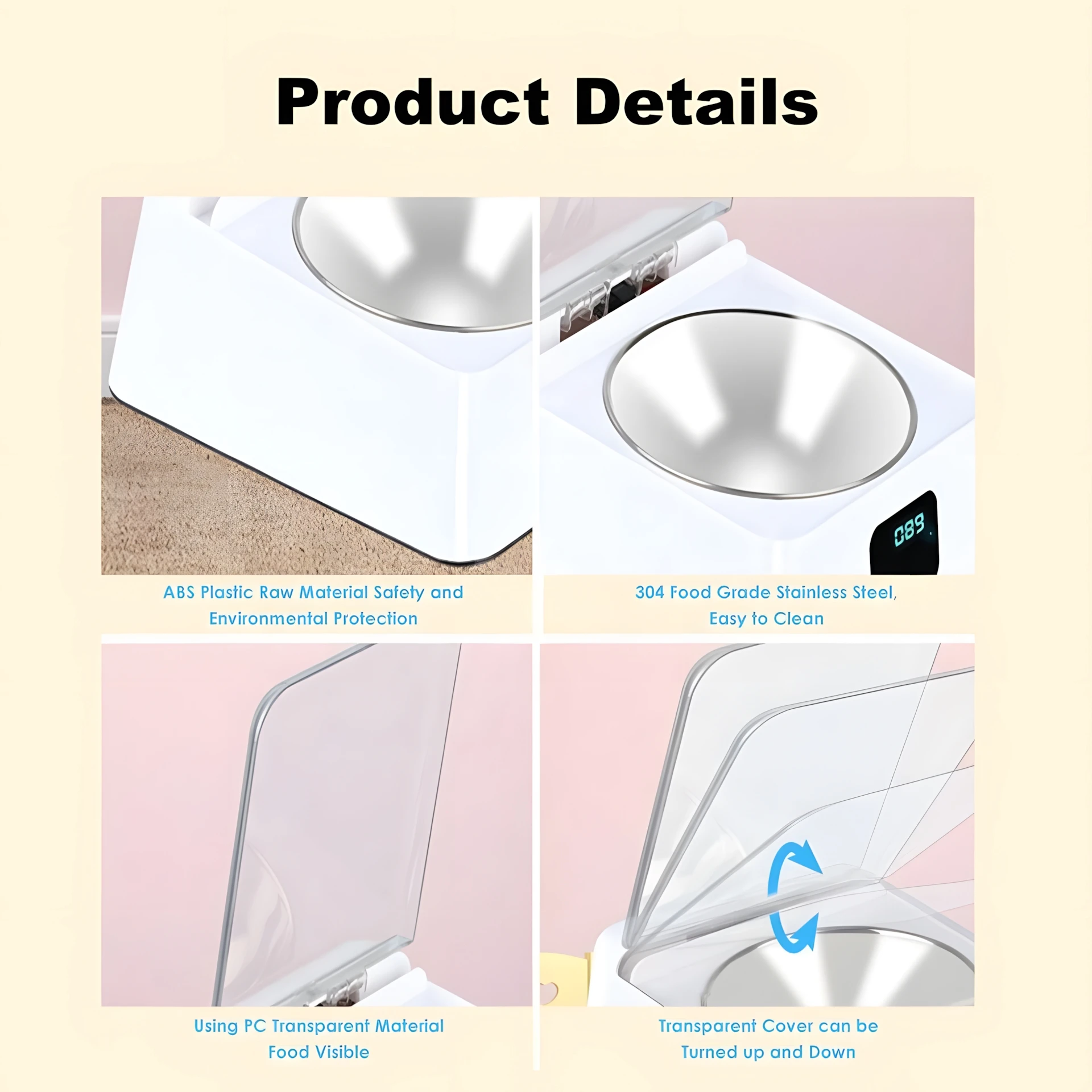 【Material seguro】: alimentador inteligente con material ABS, seguro y respetuoso con el medio ambiente.El recipiente interior está hecho de acero inoxidable de calidad alimentaria, fácil de limpiar y seguro para la salud de su mascota.