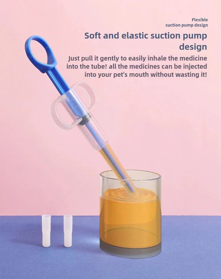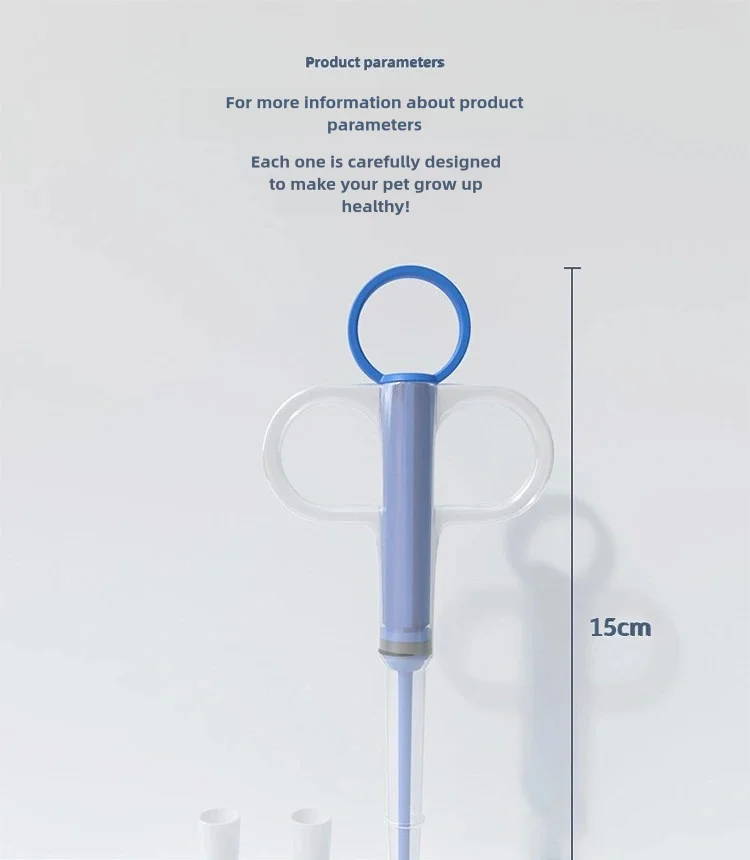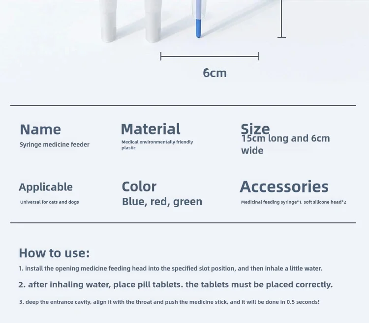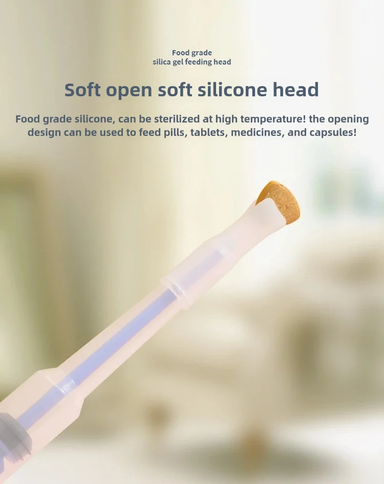 Diferentes tubos de silicona: vienen con 2 estilos diferentes de tubos de alimentación, uno de los cuales puede contener las pastillas pequeñas y el otro es adecuado para alimentar líquidos;Nota: La punta suave debe estar completamente con mangas en la parte superior hasta que no se pueda guardar.