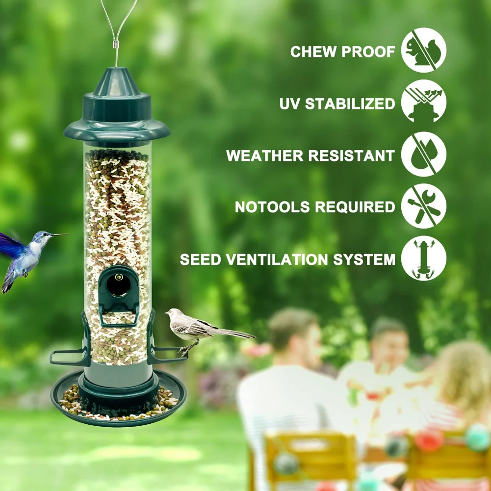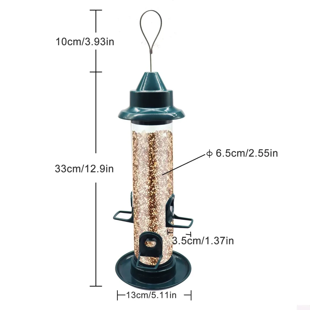 Material de alta calidad: el comedero para pájaros está hecho de material plástico de alta calidad, lo que hace que el comedero para pájaros sea ligero y fuerte y no sea fácil de desvanecer. El tubo de plástico transparente facilita el seguimiento de los niveles de semillas de aves.