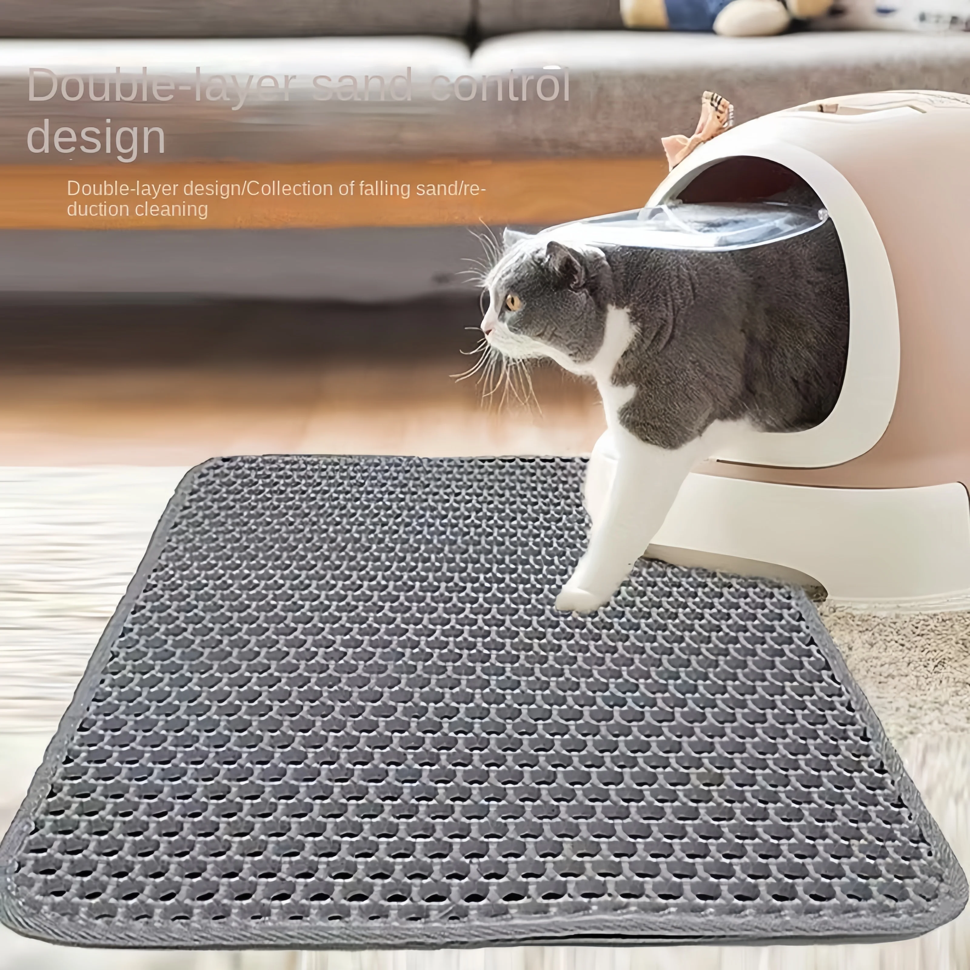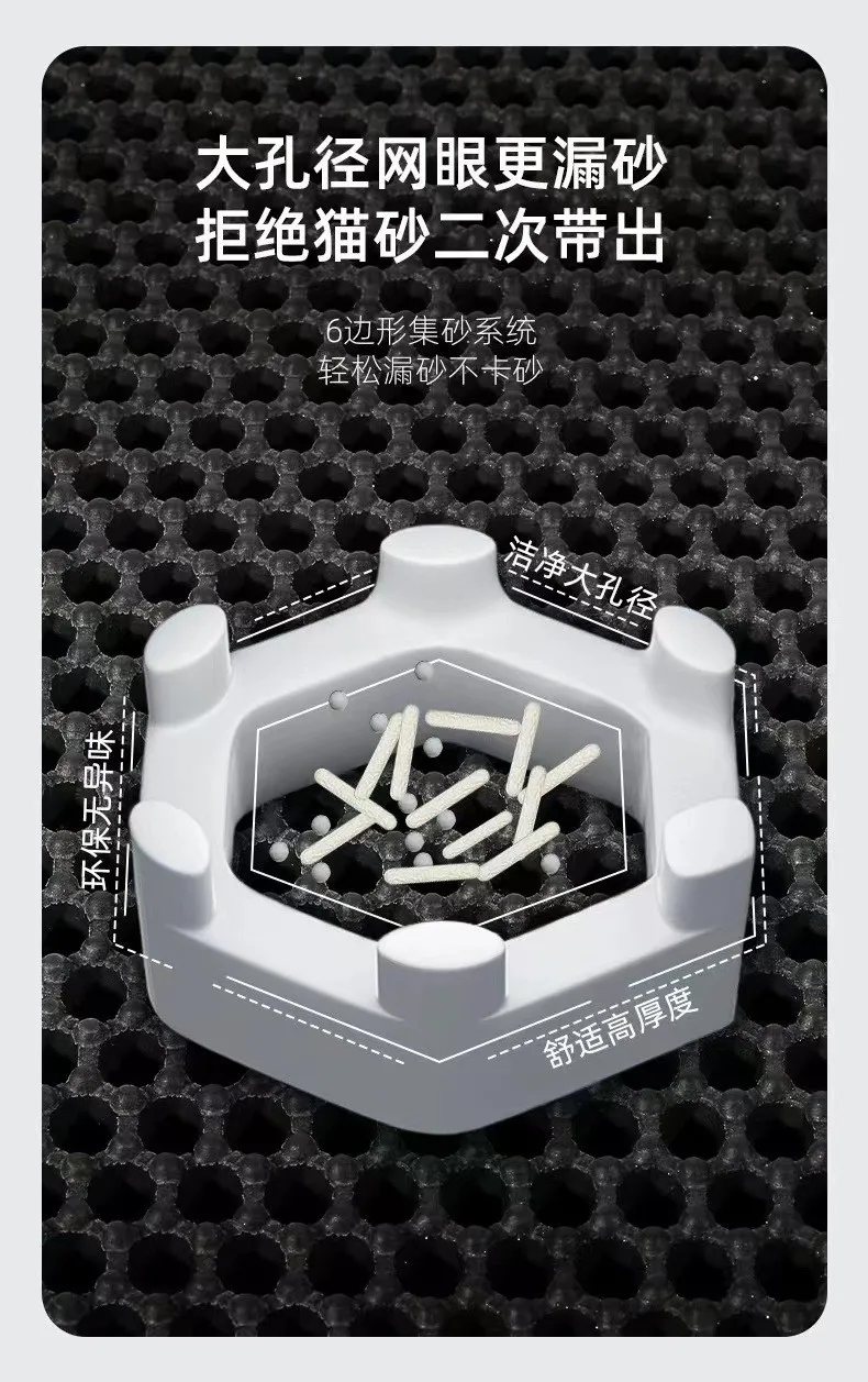 1.Es adecuado para más del 95% de los tipos de arena para gatos, la capa superior es de material con orificio pasante, la arena para gatos puede pasar fácilmente y la capa inferior es de material impermeable, la arena para gatos, la orina y otra suciedad pueden acumularse aquí.La almohadilla para arena para gatos está diseñada con capas superior e inferior: la capa superior adopta un diseño cóncavo y convexo de orificio hexagonal, además de evitar que la arena para gatos salpique después de caerse, el tacto suave esférico también puede evitar que los gatos se rayen y la parte inferior La capa está sellada para gatos.Arena, la parte inferior está diseñada con orificios redondos regulares, que son efectivamente antideslizantes para evitar que el gato rampant se resbale y se lesione.