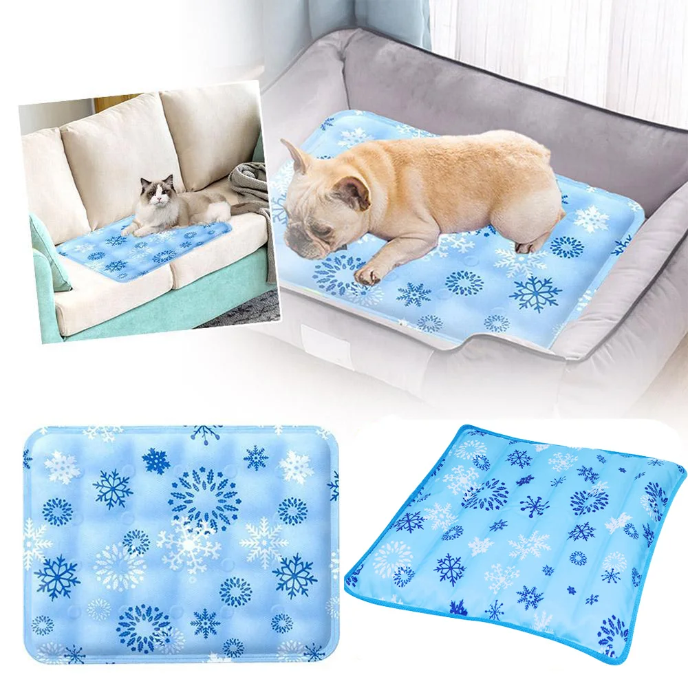 Esta almohadilla refrescante para mascotas presenta un color azul fresco con delicados patrones de copos de nieve, creando una refrescante atmósfera de verano.El patrón es hermoso y no se decolora fácilmente, ya sea colocado sobre pisos interiores, sofás o terrazas al aire libre, puede convertirse en una presencia llamativa, agregando un color único al espacio de las mascotas.