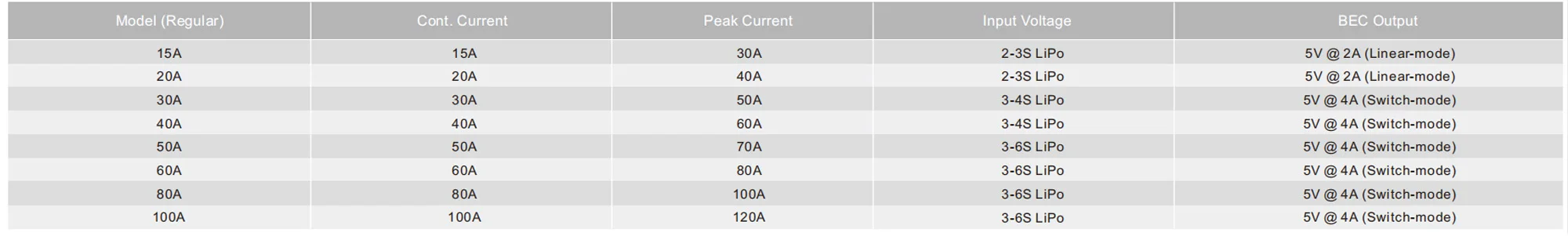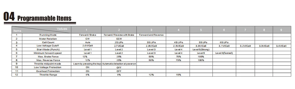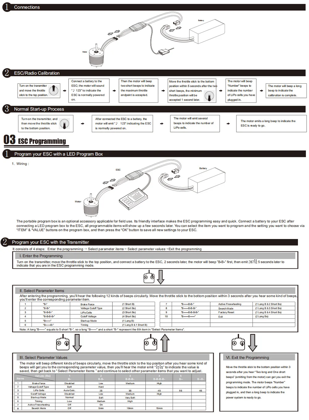 El rango de aceleración predeterminado de este ESC es de 1100 μs a 2000 EE. UU. (el estándar de Futaba); los usuarios deben calibrar el rango del acelerador cuando comienzan a usar un nuevo ESC sin escobillas u otro transmisor.