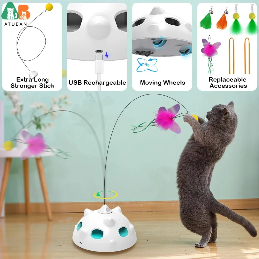 【Juguete interactivo para gatos Ambush 】-con una bonita pluma desmontable que sale aleatoriamente de uno de los seis agujeros al encender el juguete para mascotas. A tu gatito le encantará e intentará atraparlo. El juego Ambush dejará una experiencia de caza misteriosa y estimulante para su mascota. 【Multifunciones 】-Este juguete automático para emboscada para mascotas proporciona soporte rápido/soporte lento/modo de movimiento, encendido/apagado automático, puede apagarse automáticamente después de 5 minutos para evitar que su gatito se canse demasiado. Cuando su gato toque estos juguetes interactivos de nuevo, funcionará automáticamente hasta 5 minutos de temporizador automático. 【Cambio automático de dirección】-hay tres ruedas especiales debajo de los juguetes para gatos, debido a este diseño profesional y al propio sistema de equilibrio, la pelota cambiará automáticamente su dirección al chocar con una pared, silla, puerta, etc. no requiere ayuda adicional. 【Irregular Running】: Encienda el modo de movimiento, los juguetes electrónicos para gatitos funcionarán irregularmente y parpadearán diferentes lámparas LED que cambian de color al mismo tiempo. Pluma desmontable o bola que sale aleatoriamente de 6 agujeros, estimulará el instinto de caza de su gato o perro. Es una excelente manera de ayudar a su mascota a hacer ejercicio y mantenerse más saludable. 【Carga USB y batería de gran capacidad】-Batería recargable integrada de 900mAh y viene con puerto USB, este juguete para mascotas puede durar 7-14 horas después de una carga completa durante 2 horas. Ahorra más dinero en la compra de baterías.