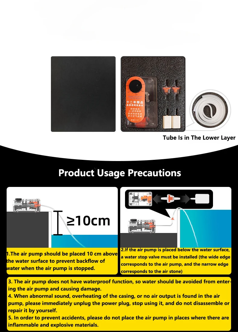 1. La bomba de aire debe colocarse 10 cm por encima de la superficie del agua para evitar el reflujo de agua cuando la bomba de aire se detiene.