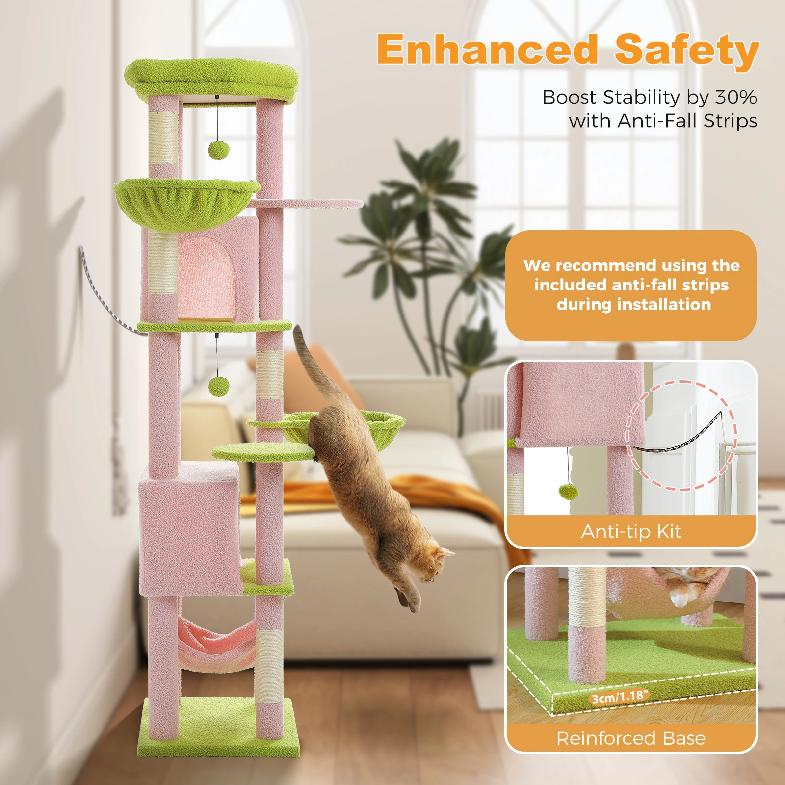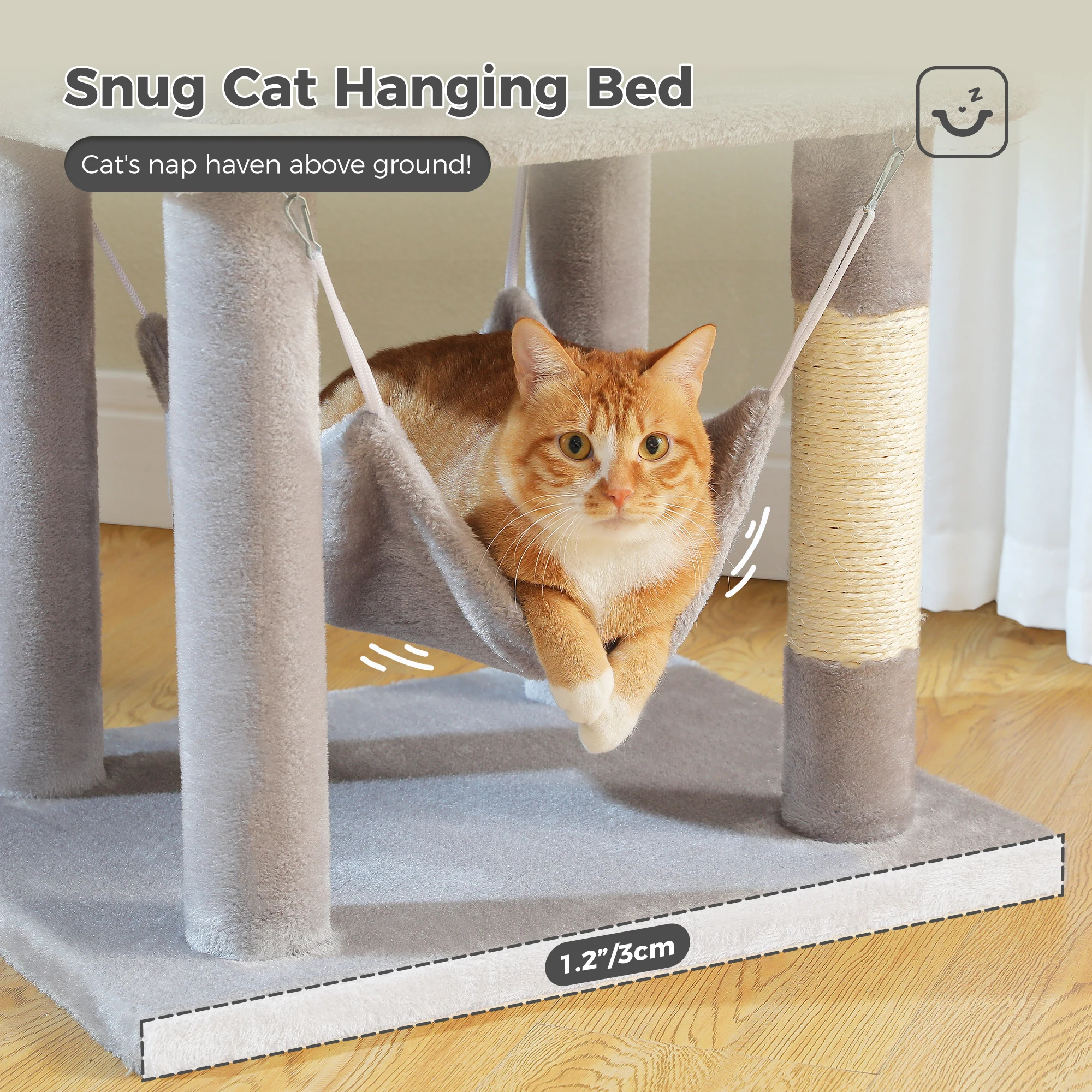 Estabilidad mejorada con base engrosada:Construida con una base reforzada y engrosada, esta torre para gatos garantiza una estabilidad y seguridad superiores.La base robusta evita que se vuelque y se tambalee, lo que permite que sus gatos jueguen y exploren con confianza.