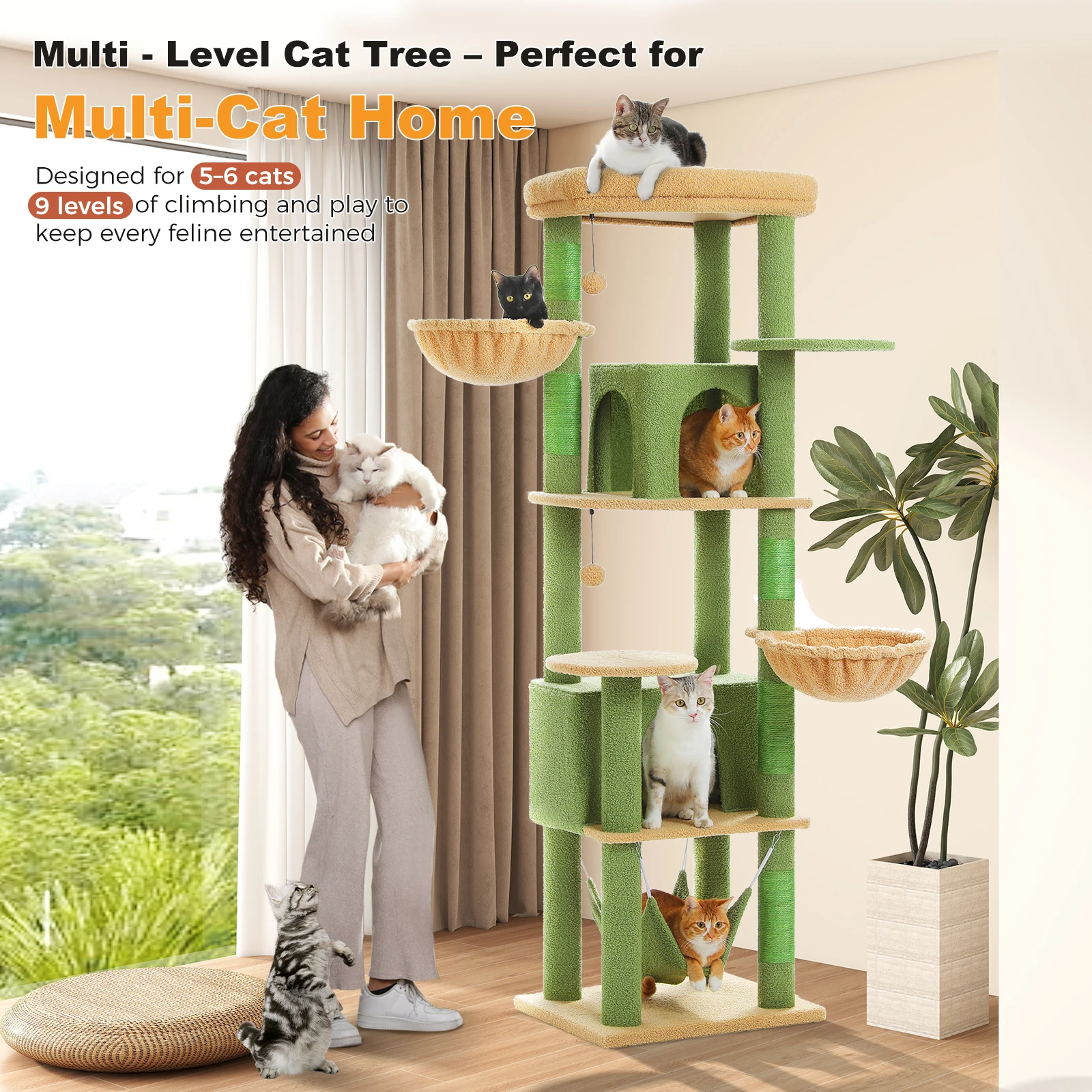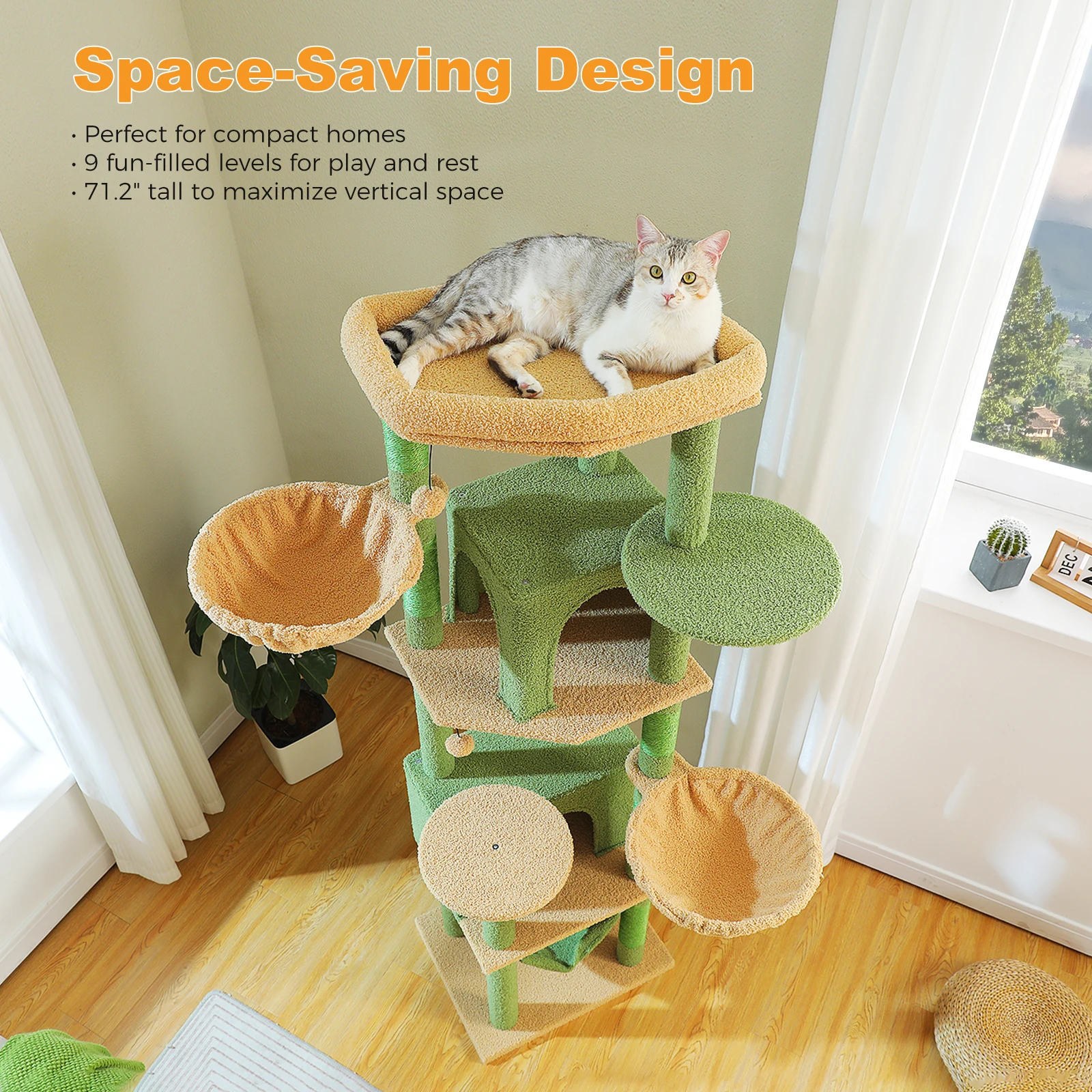 Diseño que ahorra espacio:Esta torre para gatos de 71,2''/181 cm de altura maximiza el espacio vertical, lo que la convierte en una opción ideal para hogares con área limitada.Su tamaño compacto le permite brindarles a sus gatos una experiencia completa de escalada y descanso sin sacrificar el valioso espacio habitable.