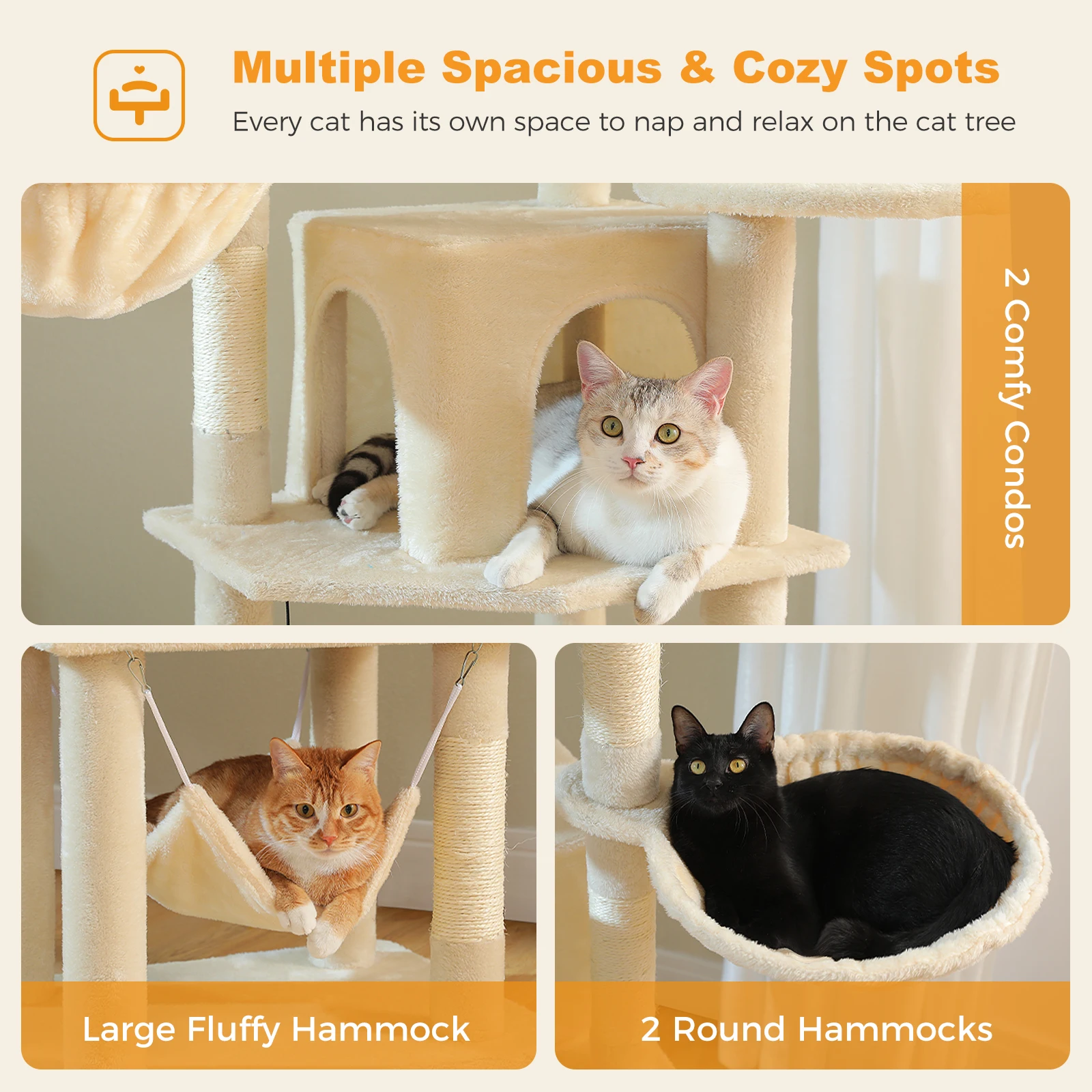 Condos duales y espaciosos:La torre para gatos incluye dos condominios espaciosos que ofrecen a tus amigos felinos retiros acogedores para descansar y tomar una siesta.Estos condominios están diseñados para adaptarse a gatos de todos los tamaños, proporcionándoles escondites seguros y cómodos.