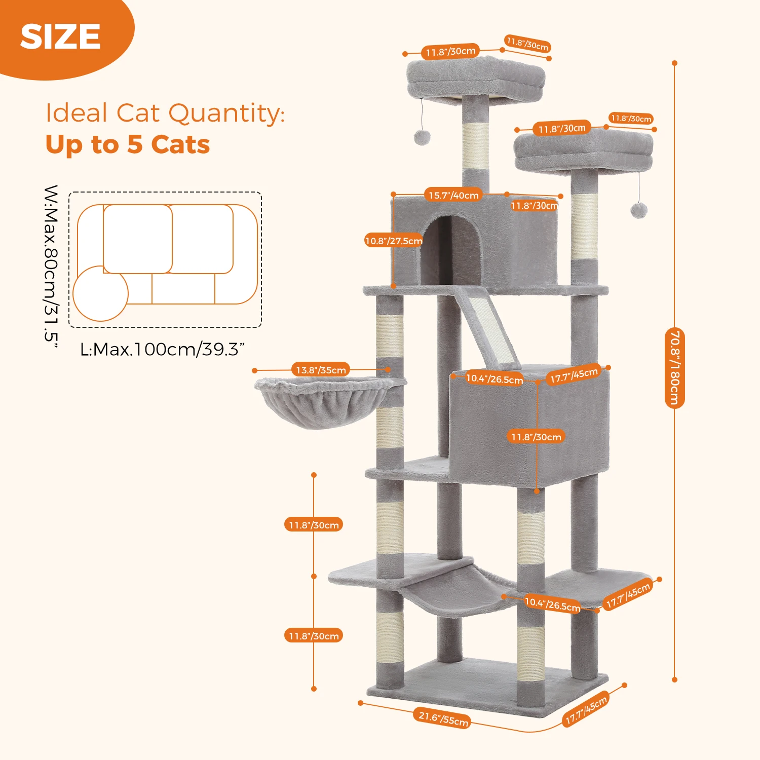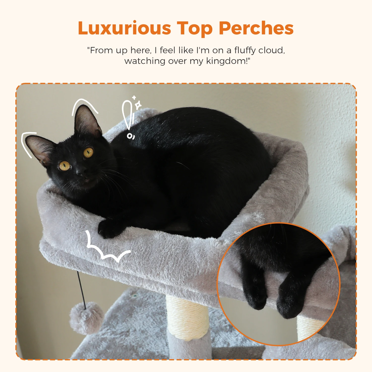 Condo para gatos grandes y perchas superiores acogedoras:Este árbol para gatos cuenta con dos lujosas perchas superiores y dos espaciosas cuevas para gatos, lo que proporciona múltiples puntos cómodos para que los gatos se relajen y observen, perfecto para hogares con múltiples gatos.