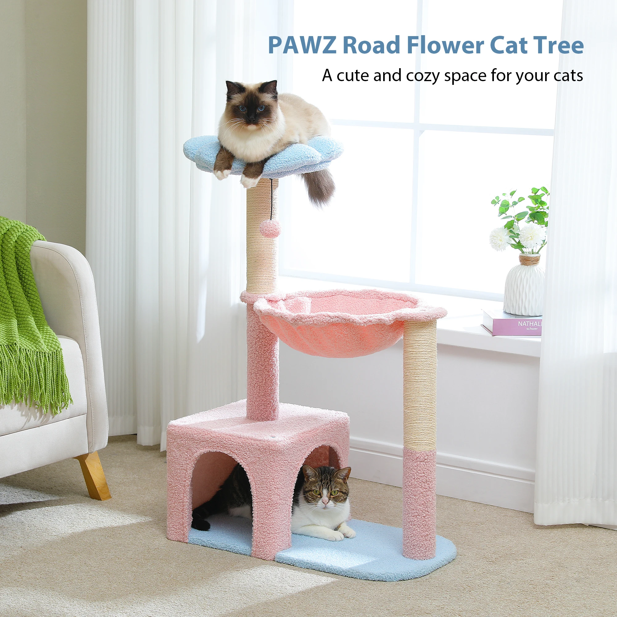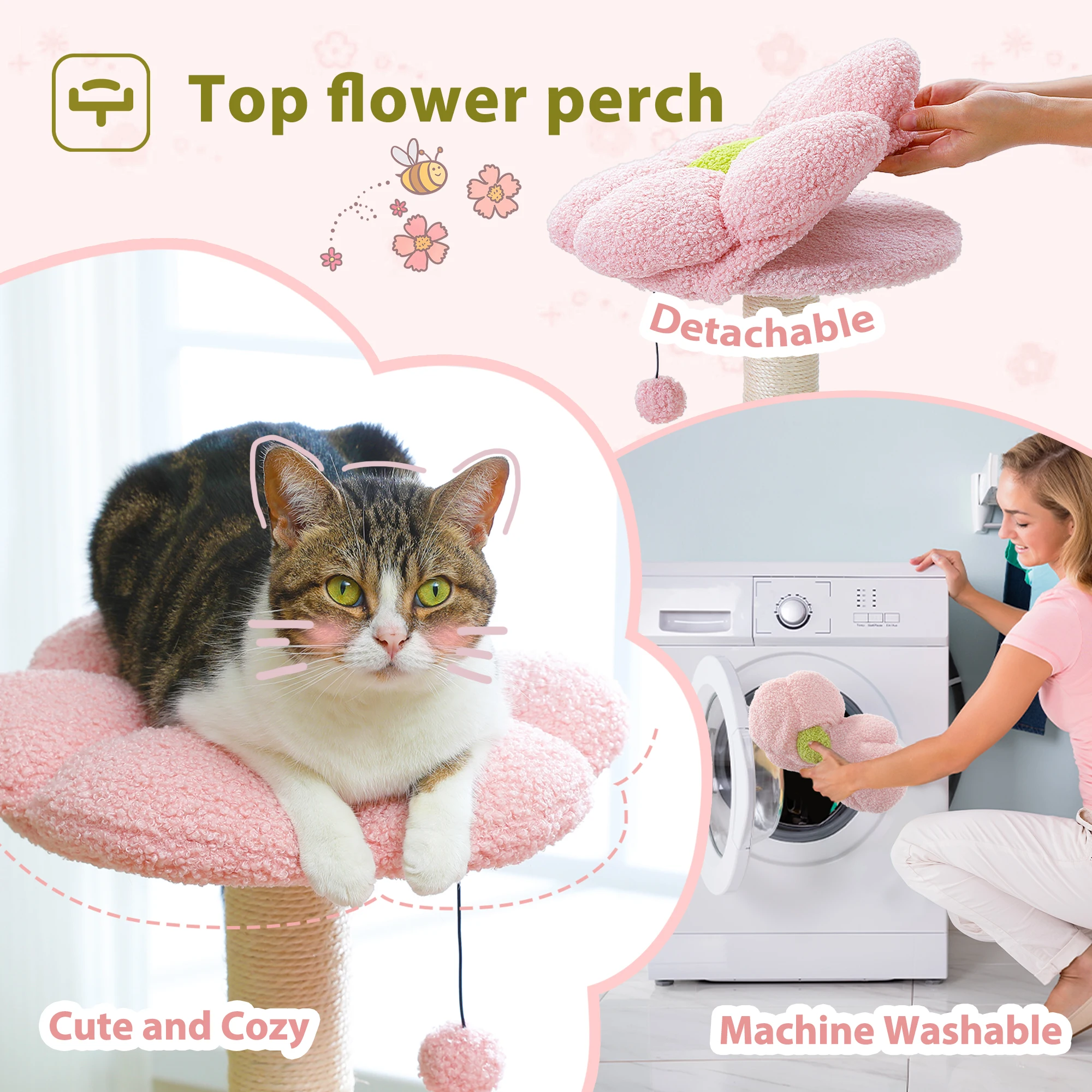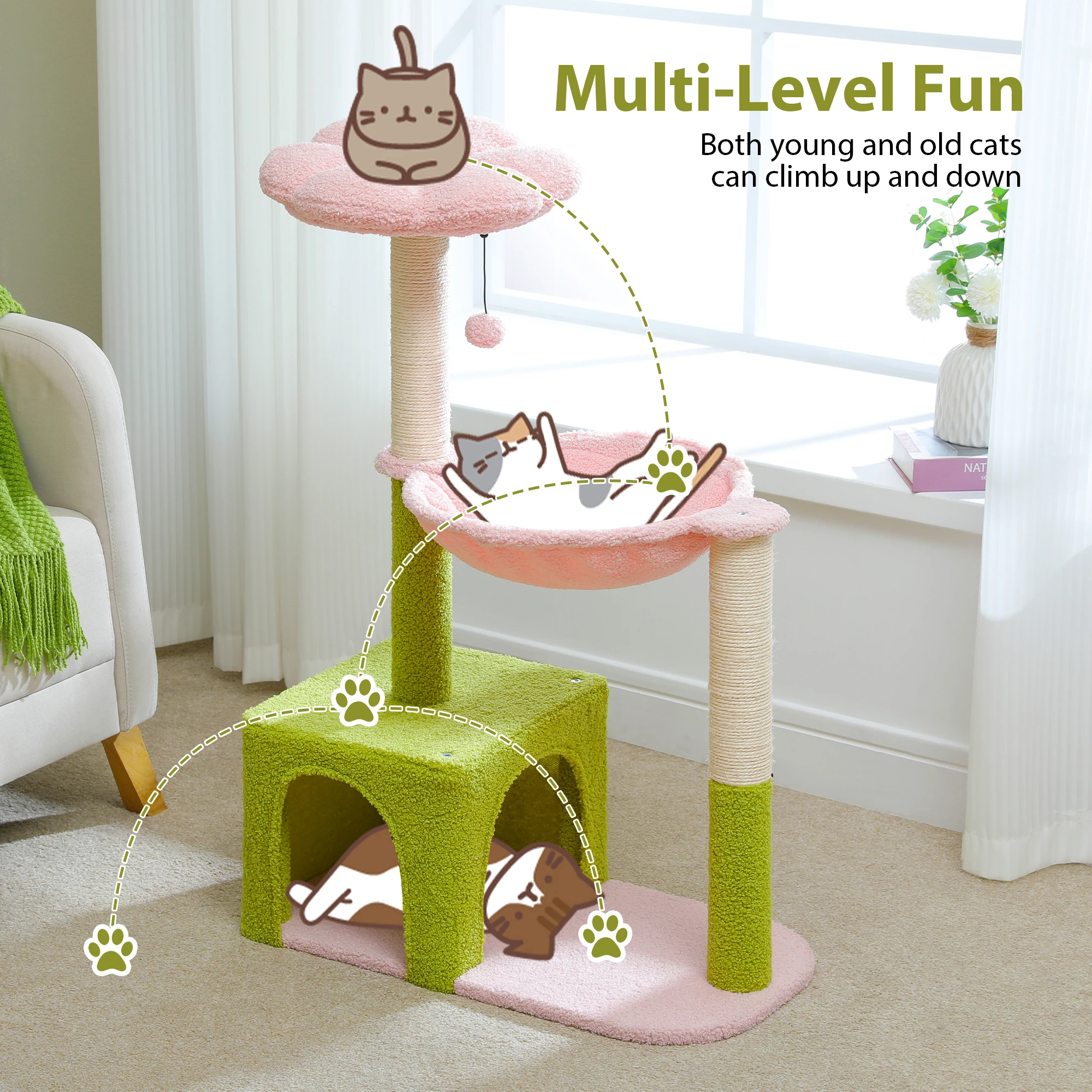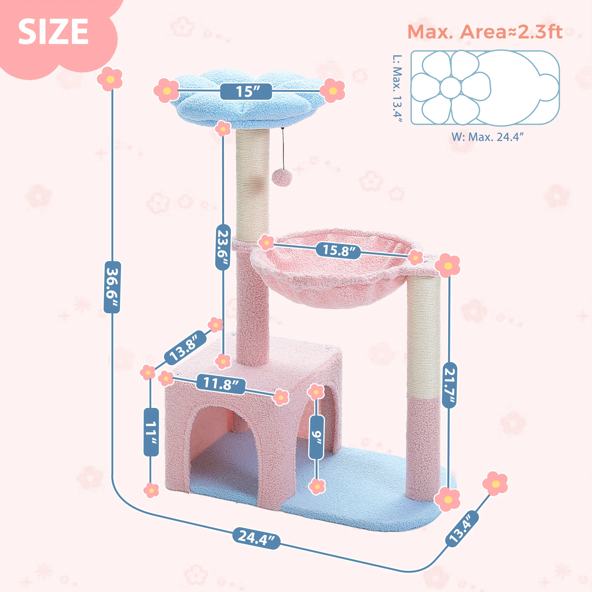 [🌸Árbol para gatos de flores] Arañazos de sisal natural y una bola esponjosa para sus garras, una acogedora hamaca para descansar y un espacioso condominio para gatos de dos puertas para privacidad, este árbol para gatos ofrece la combinación perfecta de entretenimiento y relajación.La parte superior está diseñada con adorables formas de flores, lo que agrega un toque de encanto al tiempo de juego de su gato.Desde jugar hasta descansar, este árbol para gatos proporciona todo lo que su amado felino necesita en un paquete elegante y funcional.