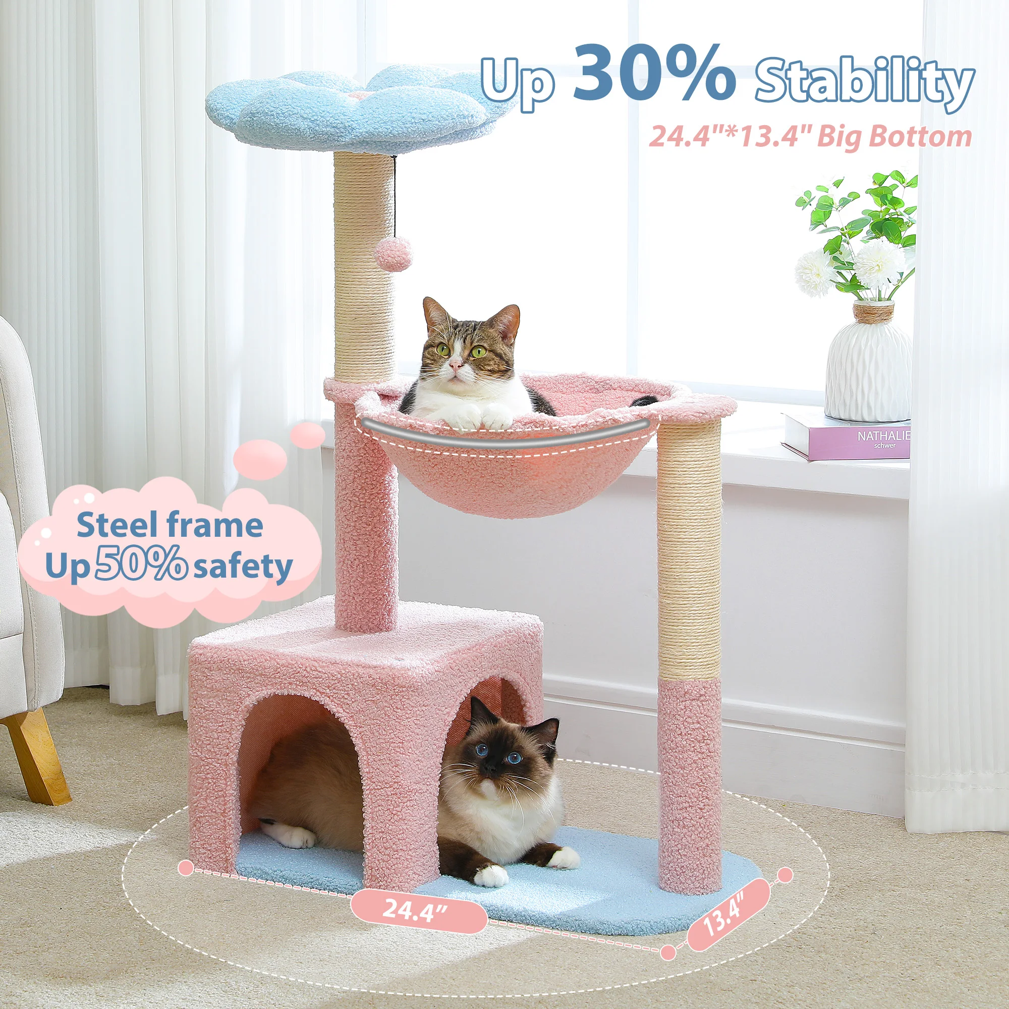 Árbol para gatos de flores con hamaca con estructura de metal grande, linda torre para gatos con postes rascadores de sisal para gatos pequeños de interior con percha rosa