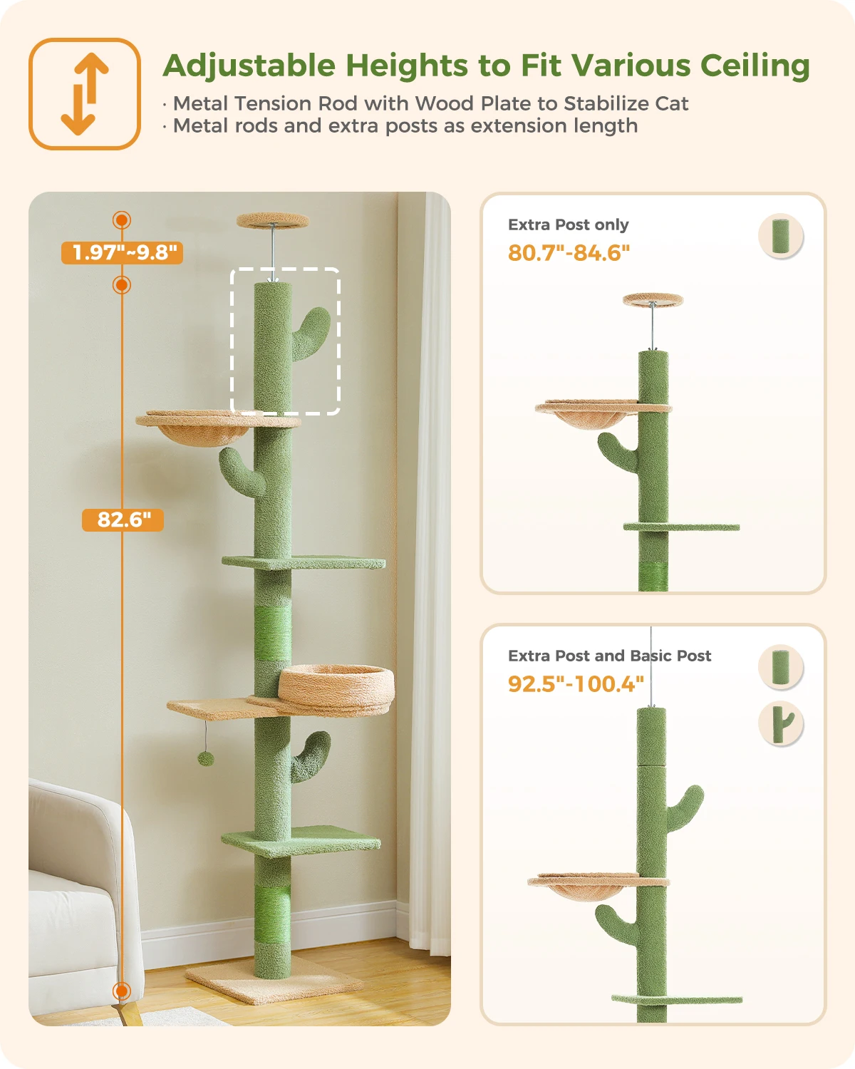Árbol para gatos de cactus de altura ajustable para gatos de interior, torre para gatos de piso a techo con poste para rascar, hamaca acogedora, bolas colgantes, juguetes para gatos