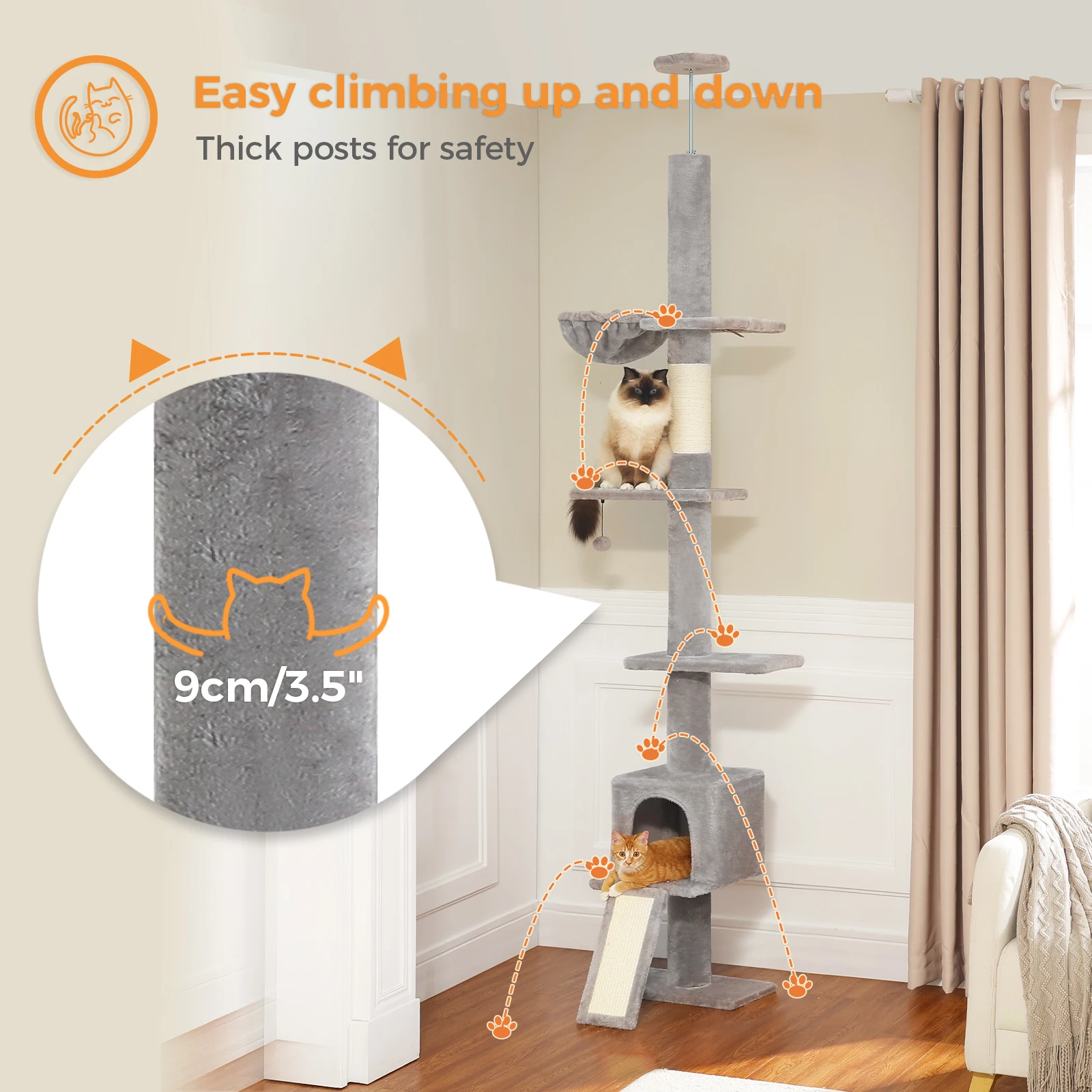 Árbol para gatos ajustable:Nuestro árbol para gatos de piso a techo está diseñado para encajar en cualquier espacio con su función de altura ajustable [210 CM-274 CM], proporcionando un árbol para gatos alto que no consume mucha área del piso.Puedes elegir diferentes formas de montar el árbol trepador para gatos siguiendo las instrucciones para que encaje perfectamente con tu techo.