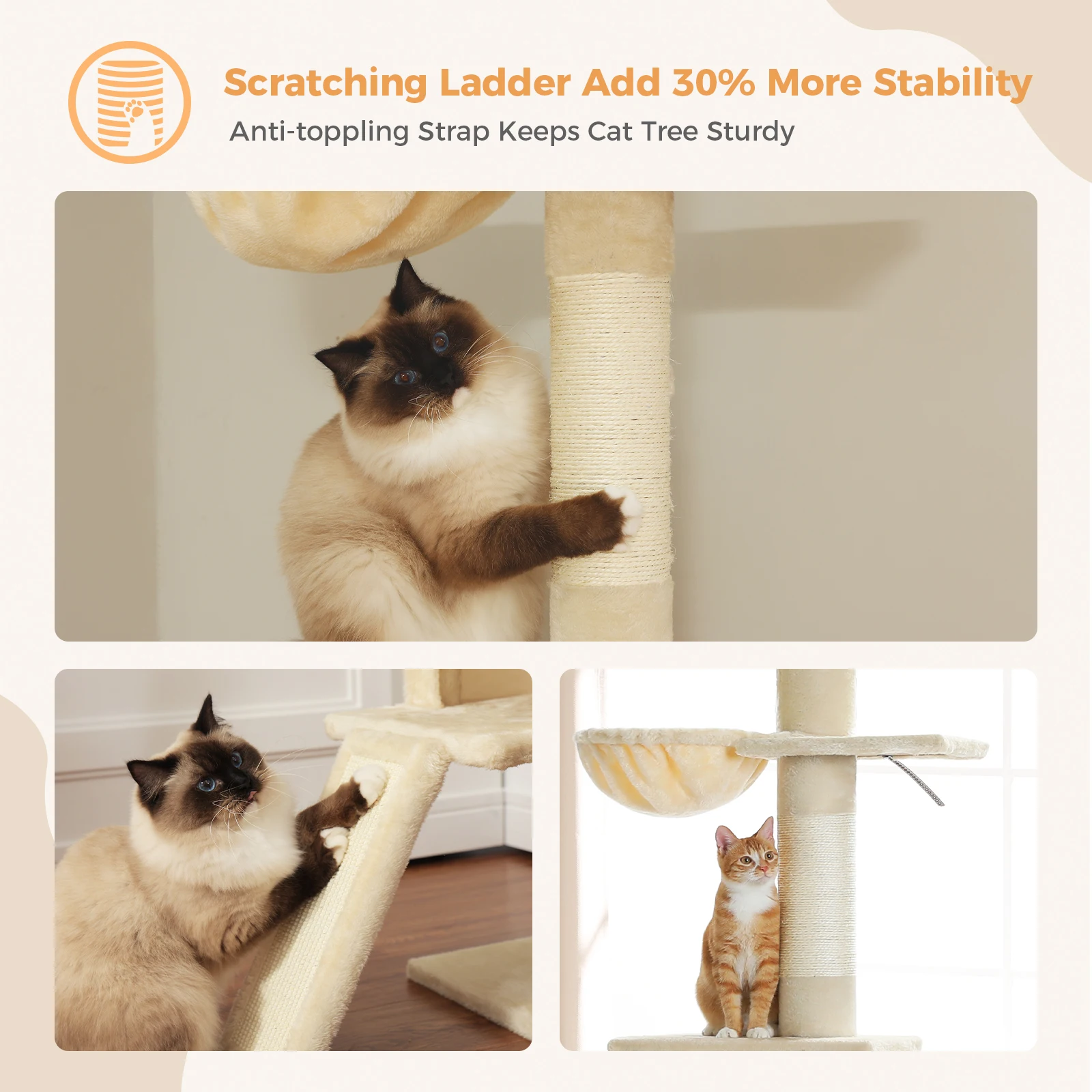 Robusto y no requiere perforación:Construido con una base robusta y materiales de alta calidad, este árbol para gatos garantiza estabilidad.Además, una escalera para rascar gatos agrega más un 30% de estabilidad a toda la torre para gatos.Además, no requiere perforación para su instalación, lo que lo convierte en un mueble conveniente para gatos para cualquier hogar.