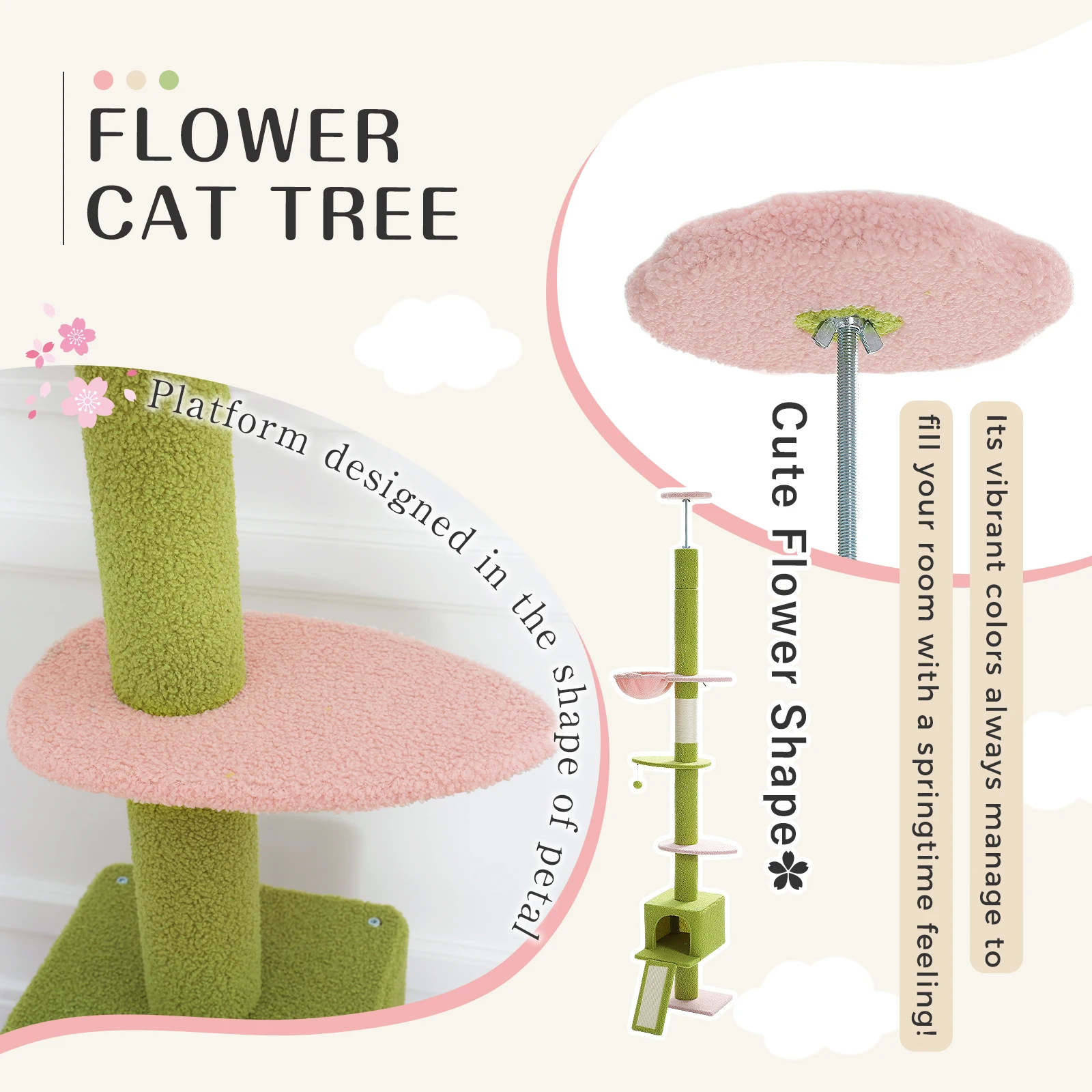 Varios colores para elegir:Proporcionamos 7 colores en este árbol para gatos, por lo que hay varias opciones según sus preferencias.Un árbol para gatos de cactus o un árbol para gatos de flores pueden ser una decoración fresca en su habitación.Mientras tanto, la torre para gatos de colores clásicos combina mejor con la decoración de su habitación.