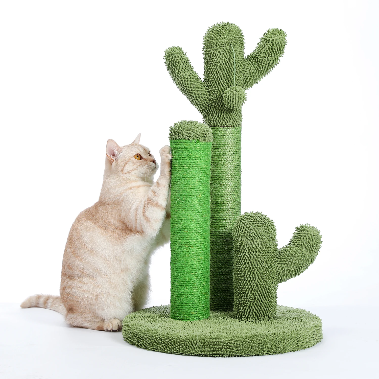 Diseño único:Este rascador para gatos con 3 postes para rascar cubiertos con sisal natural verde y alfombra sobre la base redonda como un cactus mimico que sale del desierto dorado se ve lindo y fresco que ayuda a combinarse con cualquier decoración moderna y agregar un toque divertido a cualquier habitación.