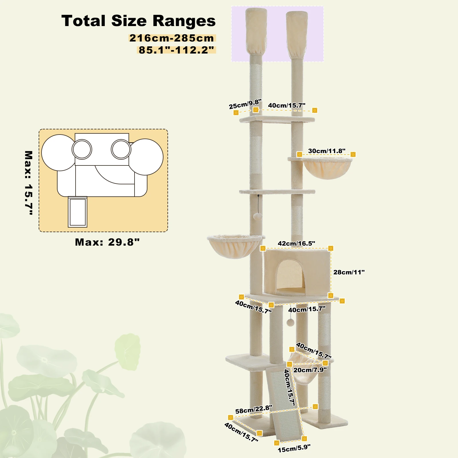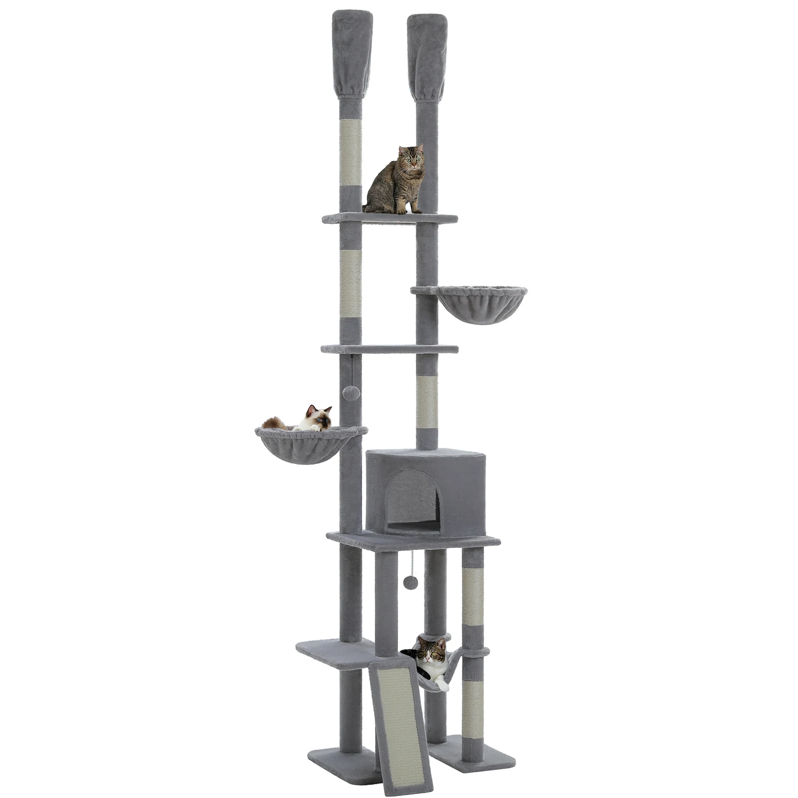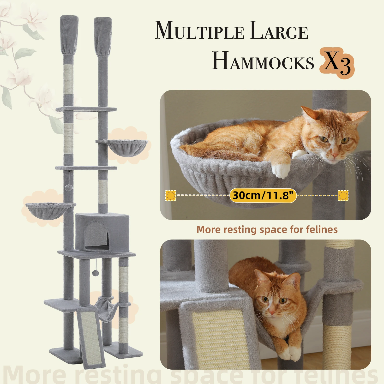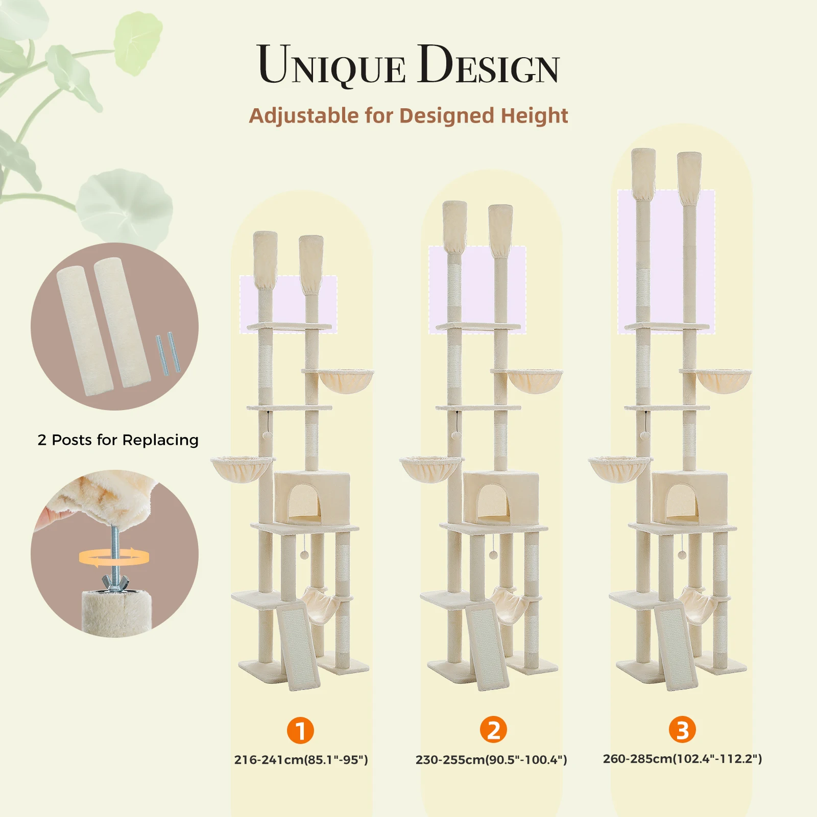 Ahorro de espacio y sin perforaciones:Diseñada para la naturaleza de los gatos de mantenerse alto, esta torre de actividades para gatos del piso al techo se ajusta en altura de 85'' a 112", ocupando el máximo espacio vertical.Con la barra tensora y sin necesidad de perforar un agujero en el techo, puede colocar esta torre para gatos en cualquier lugar de su habitación cómodamente con diferentes alturas.