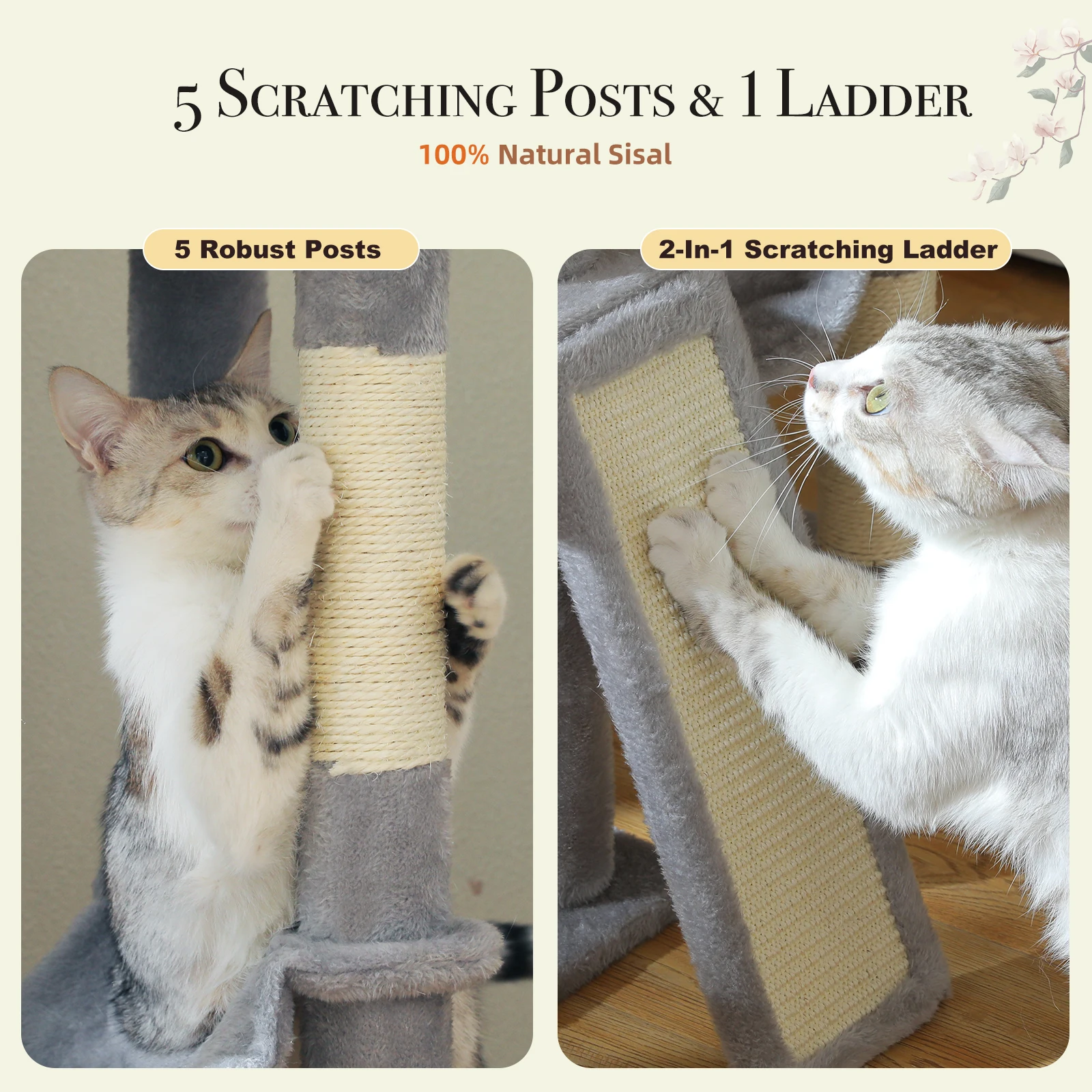 Material superior para mayor robustez:La seguridad es siempre la prioridad.A diferencia del piso de un solo poste a la torre de techo, este diseño mejorado y bien equilibrado de 2 postes en la parte superior, que agrega robustez a la estructura para ayudar a que sus gatitos suban y bajen de forma segura.Totalmente cubiertos con sisal 100% natural, los postes y la escalera son lo suficientemente resistentes como para afilar perfectamente sus garras.