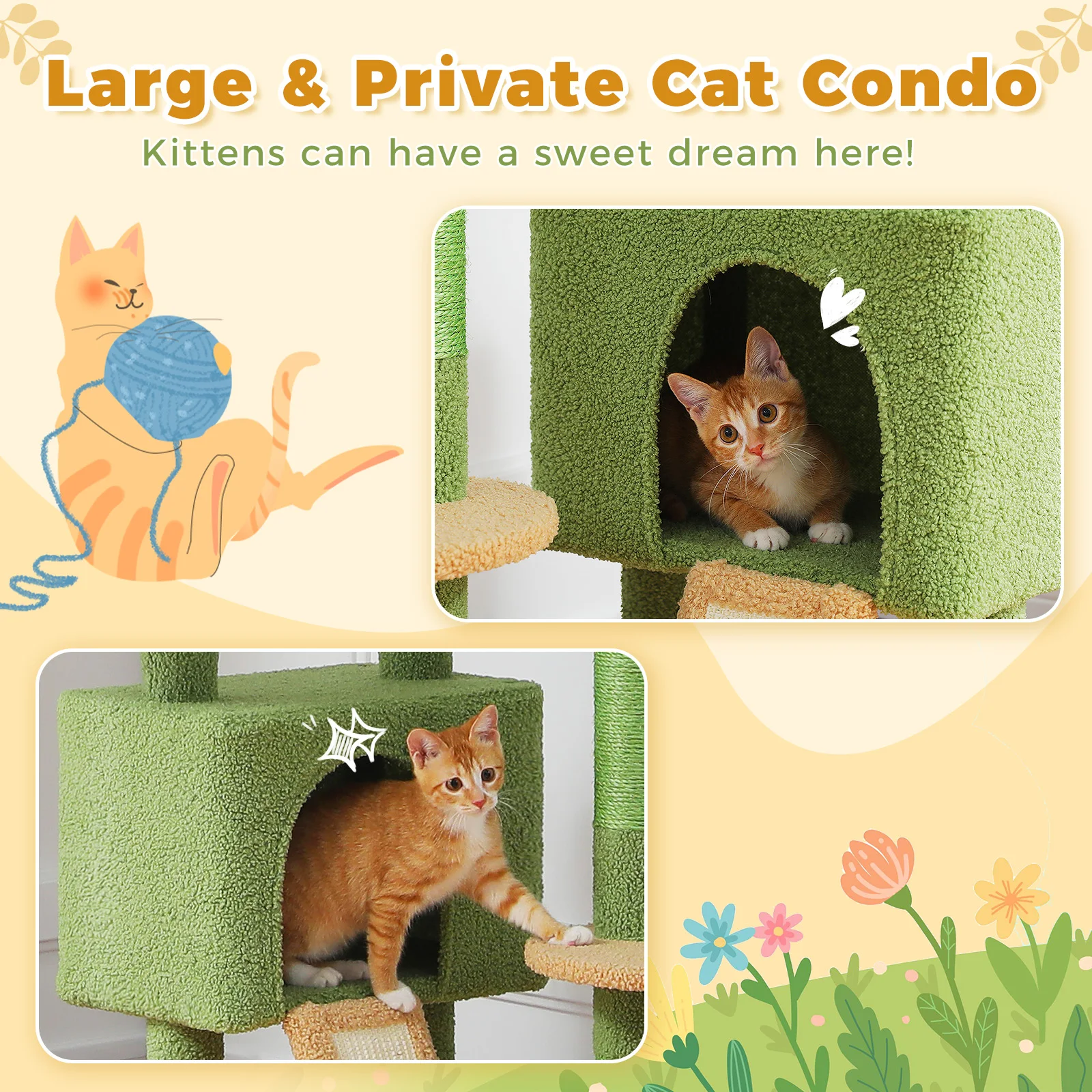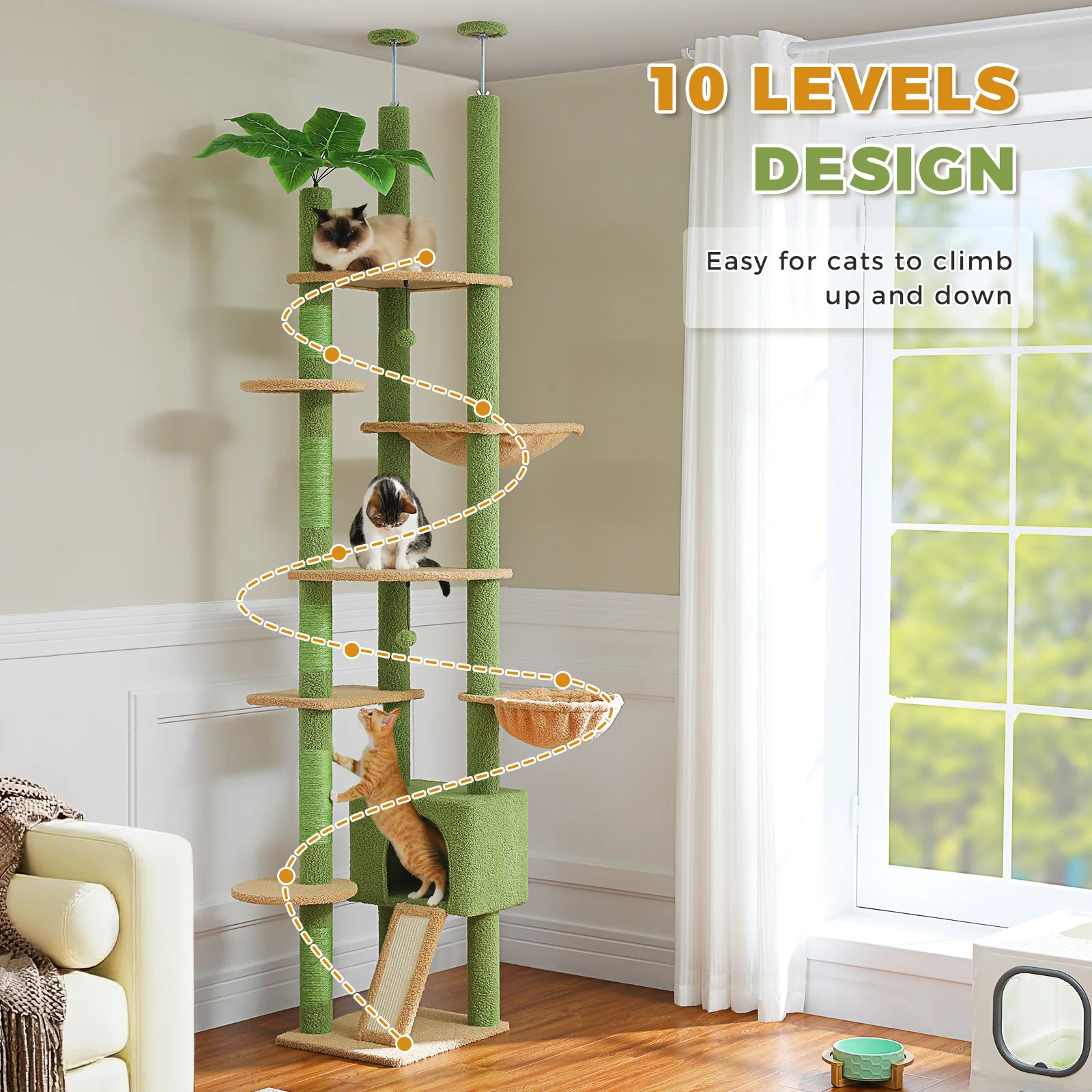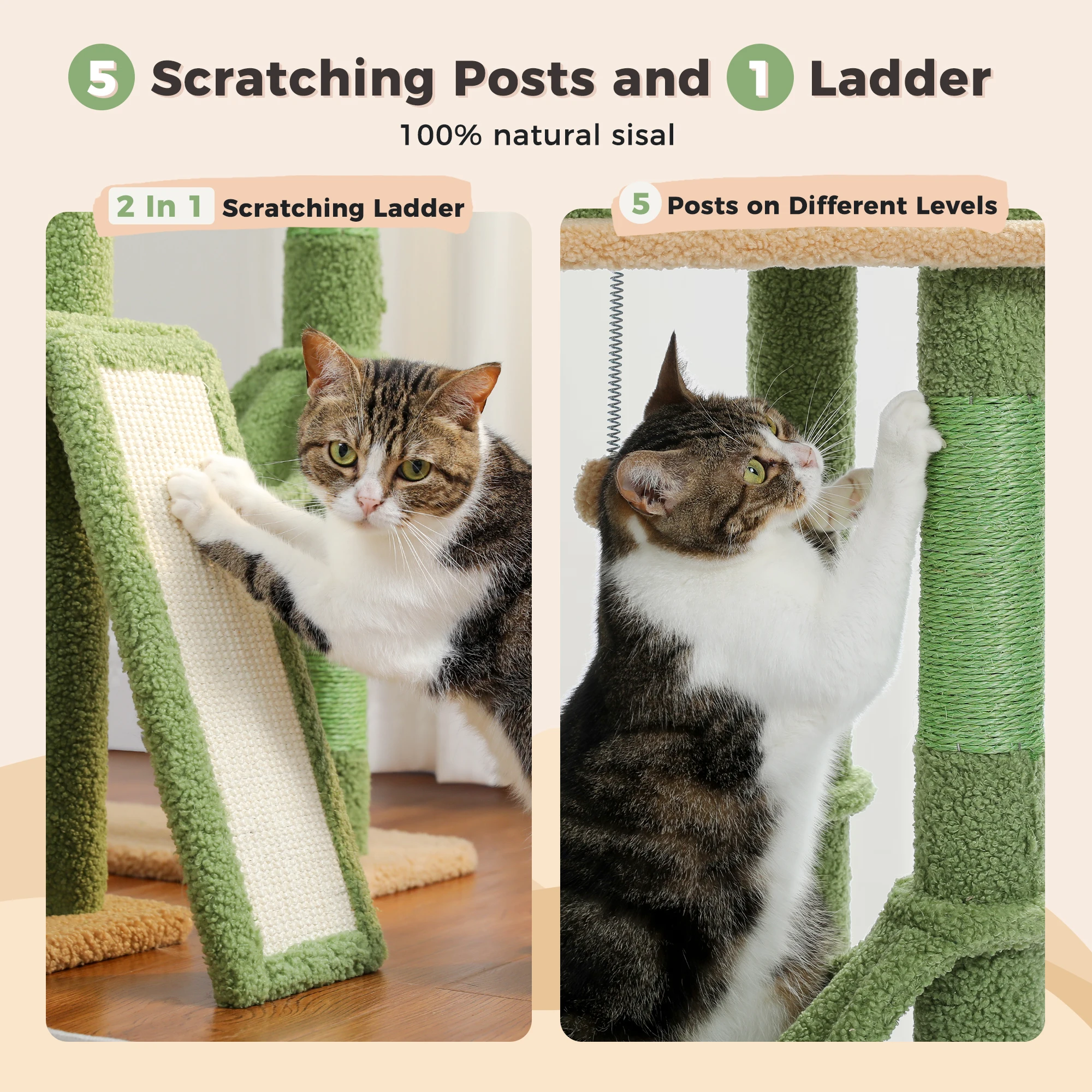 Forma única de cactus:Este árbol para gatos con forma de cactus de suelo a techo en verde y amarillo, adecuado para varios gatos, seguramente llamará toda la atención de sus gatos y también combinará perfectamente con su sala de estar.Con escalera, 5 plataformas, 3 hamacas y condominio, este árbol para gatos alto multifuncional ofrece a sus bebés peludos suficiente lugar de recreación.