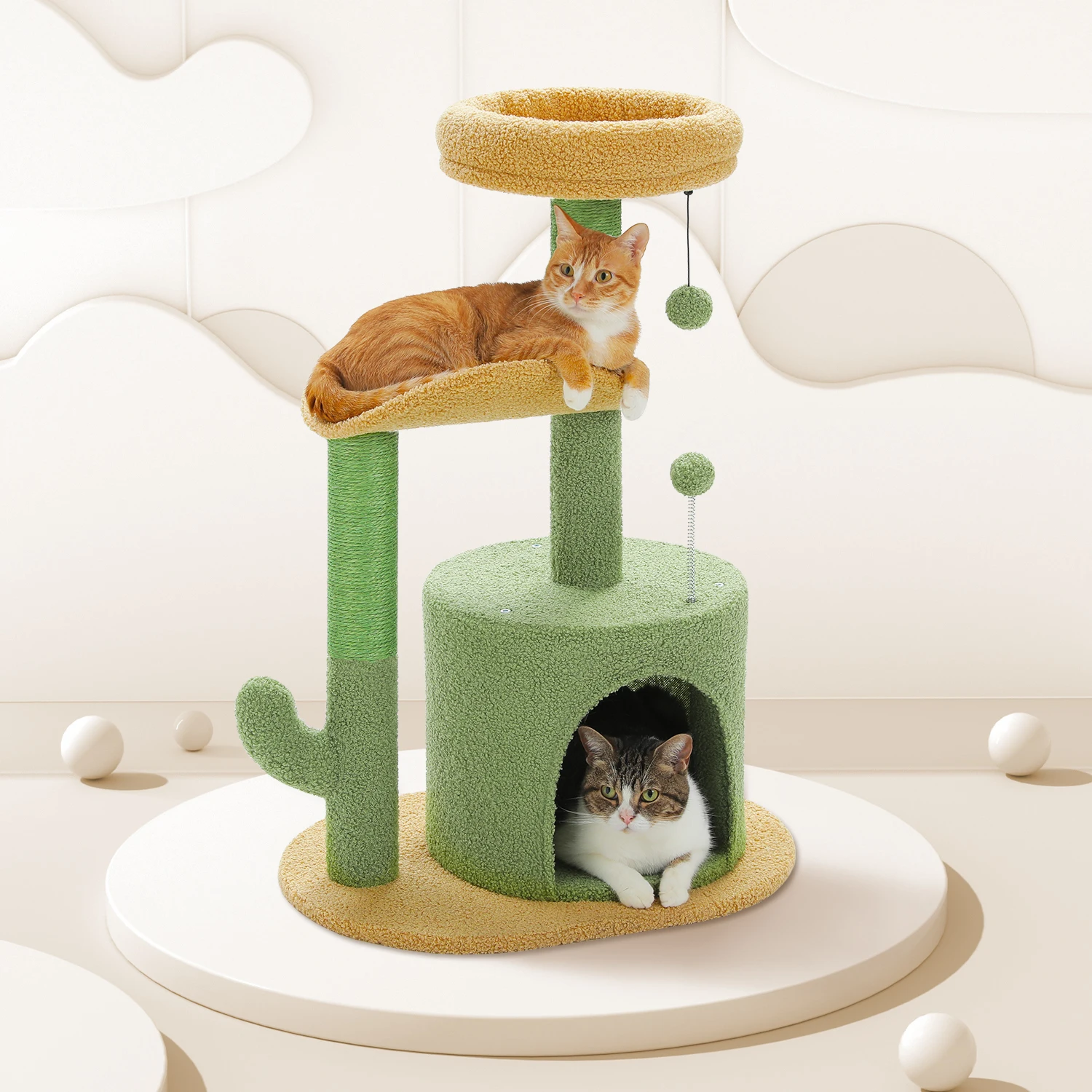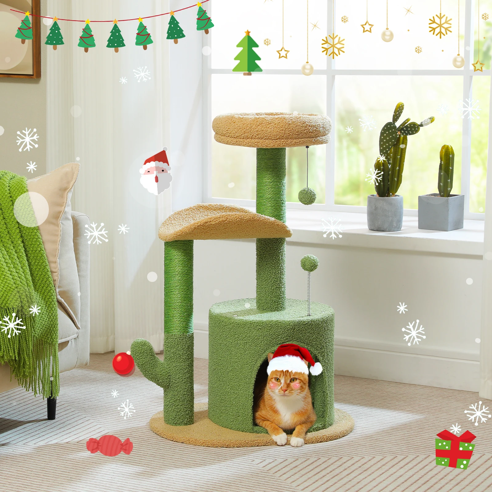 Árbol para gatos de cactus para gatos de interior, torre pequeña para gatos con poste para rascar de sisal, condominio suave, perchas de felpa, bolas mullidas, juguetes para gatos