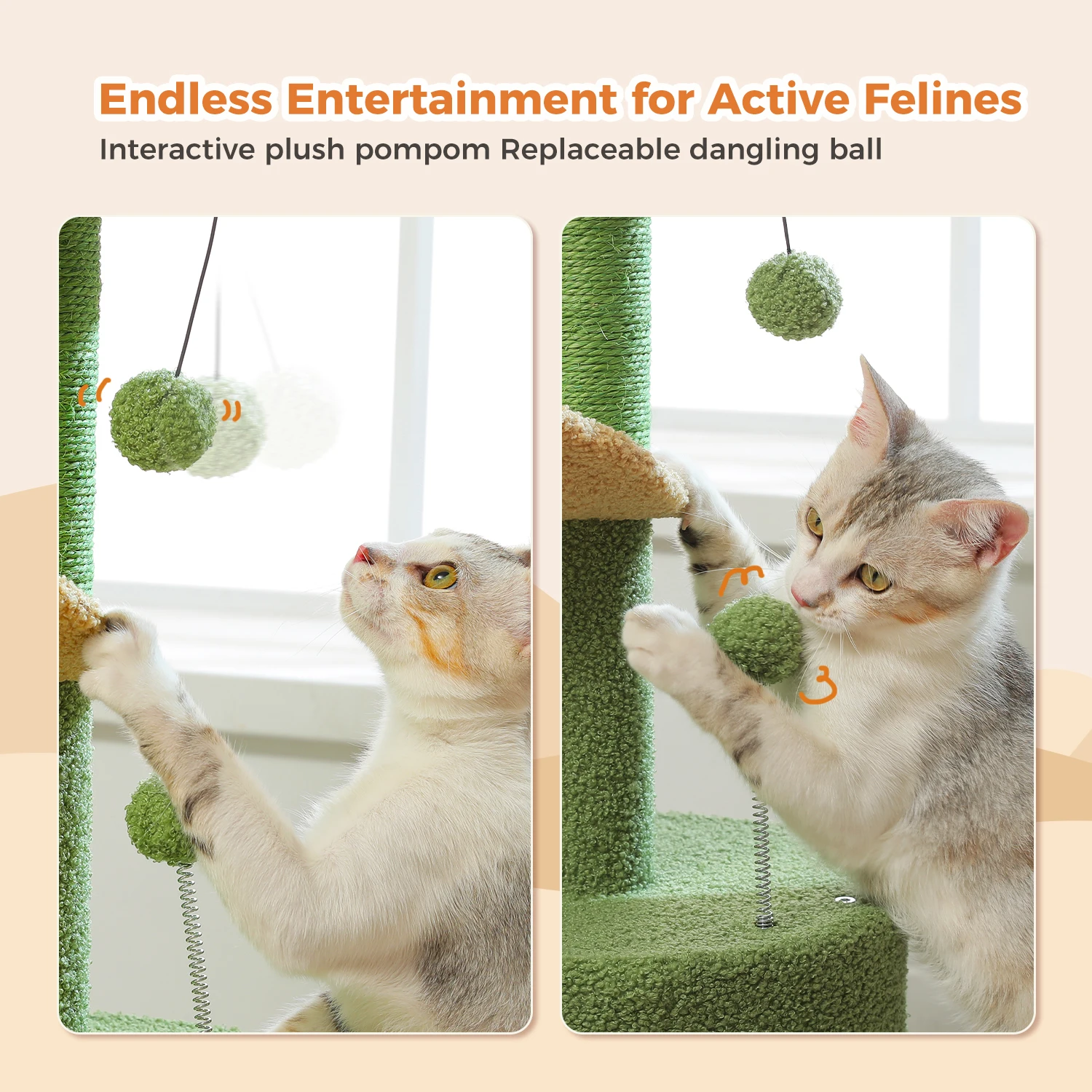 Saludable y alegre: Presentado un pompón de peluche extra desmontable en el segundo nivel que satisface al máximo el instinto de caza del gatito.Juega con la pelota colgante superior mientras descansa sobre la percha curva y divierte aún más.El rascador cubierto de sisal totalmente natural junto al condominio está diseñado para satisfacer su naturaleza raspadora.¡Diviértete sin fin mientras estás saludable!