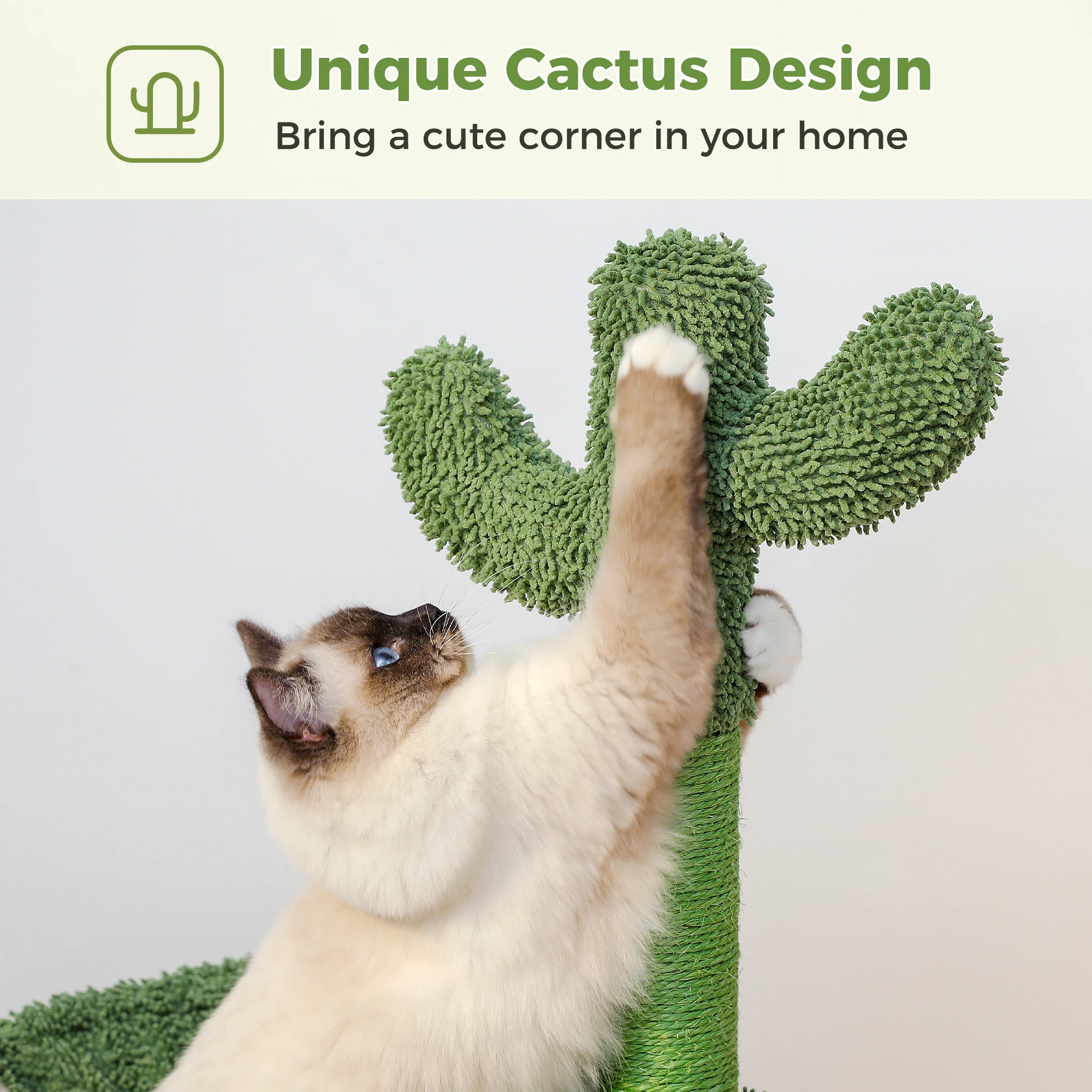 Nuestro árbol para gatos de cactus está diseñado para brindar seguridad y estabilidad, con una base duradera de madera contrachapada recubierta de tela texturizada.No se vuelca ni se tambalea cuando los gatos juegan y saltan sobre él.Durable y bien construido para resistir el juego activo.