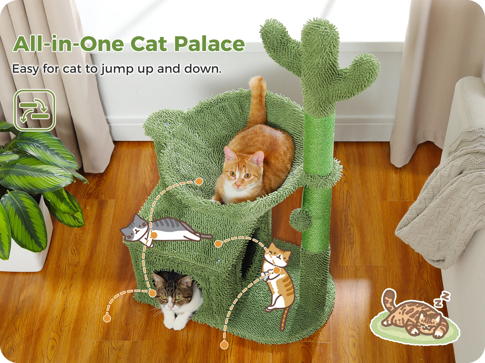 Elaborado y único:Este es un árbol para gatos de cactus multifuncional con un diseño de forma aerodinámica, sus gatitos podrían treparse y saltar sobre él libremente.No importa si quieren hacer algunos ejercicios en el rascador totalmente cubierto de sisal o tomar un descanso en los 3 lugares de descanso, ¡esta casa de juegos multifuncional funciona perfectamente como un paraíso de recreación ideal!