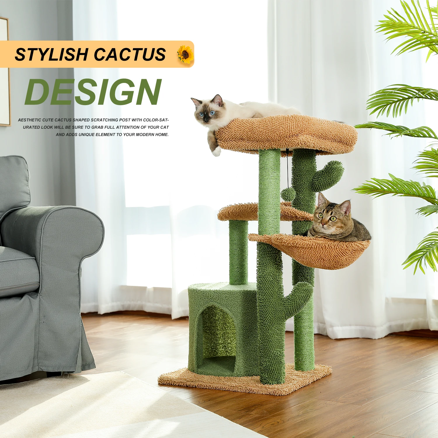Árbol para gatos único 4 en 1 con poste envuelto en sisal, plano para gatos, hamaca y bola redondeadora.Perfecto para rascarse, descansar, tomar una siesta y jugar.¡Diseño de cactus que ahorra espacio para tu amigo peludo!