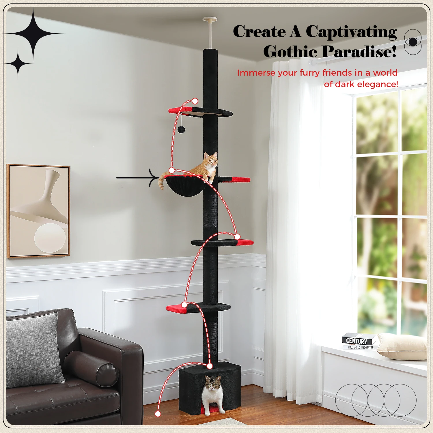 Árbol para gatos gótico, torre para gatos del piso al techo con altura ajustable, 5 niveles, condominio para gatos negros y acogedores postes para rascar hamaca
