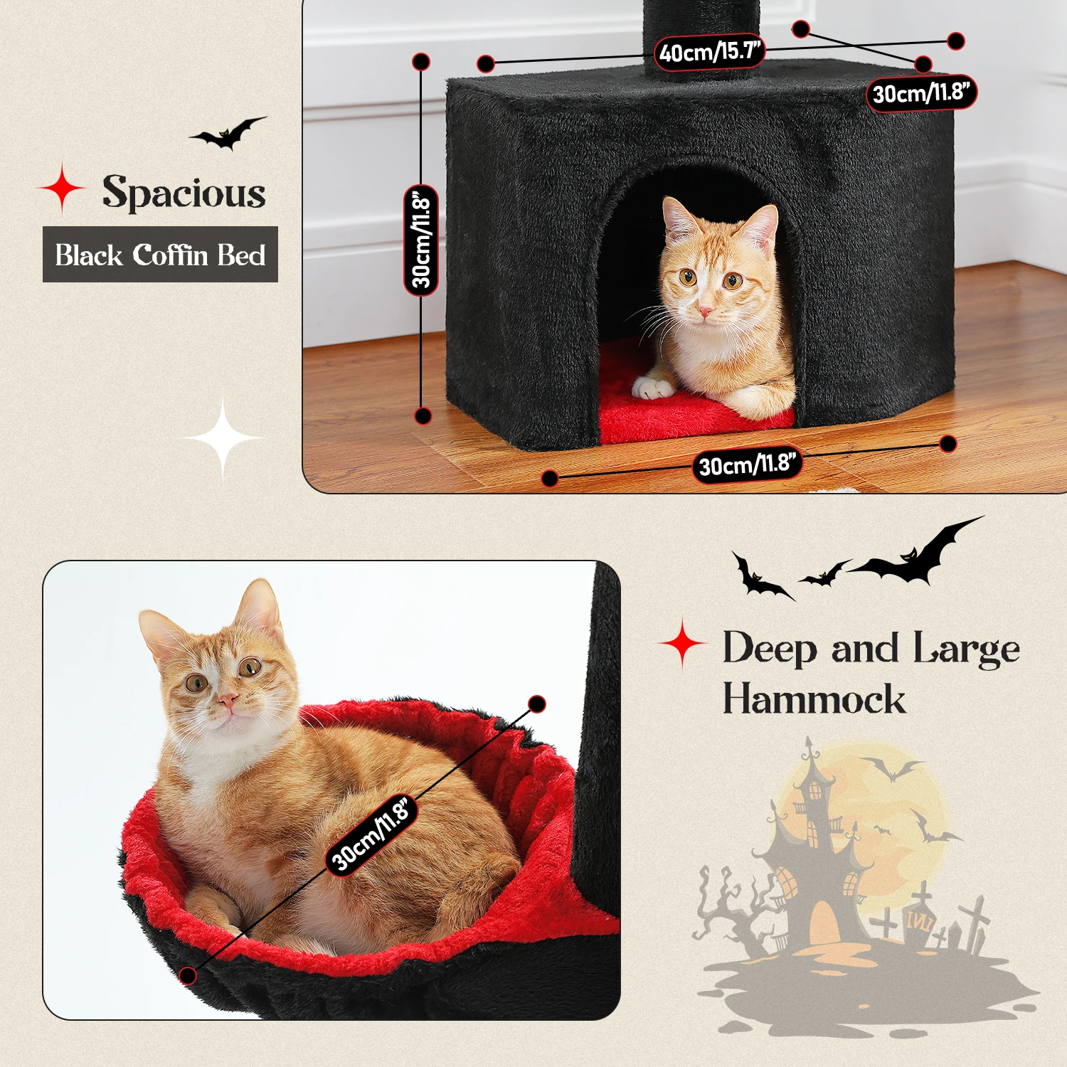 ¡Para los amantes de los gatos góticos!: Adornado en negro y rojo vívidos, este árbol para gatos gótico sin duda atraerá a tus gatos con una plataforma y un condominio en forma de ataúd.Los coloca en un misterioso mundo de la oscuridad elegancia, donde podría satisfacer las necesidades de todos los gatos de rascarse, saltar, tomar una siesta y jugar.¡Podrías disfrutar de tu amor por todo lo gótico, incluido el árbol para gatos para amigos peludos!