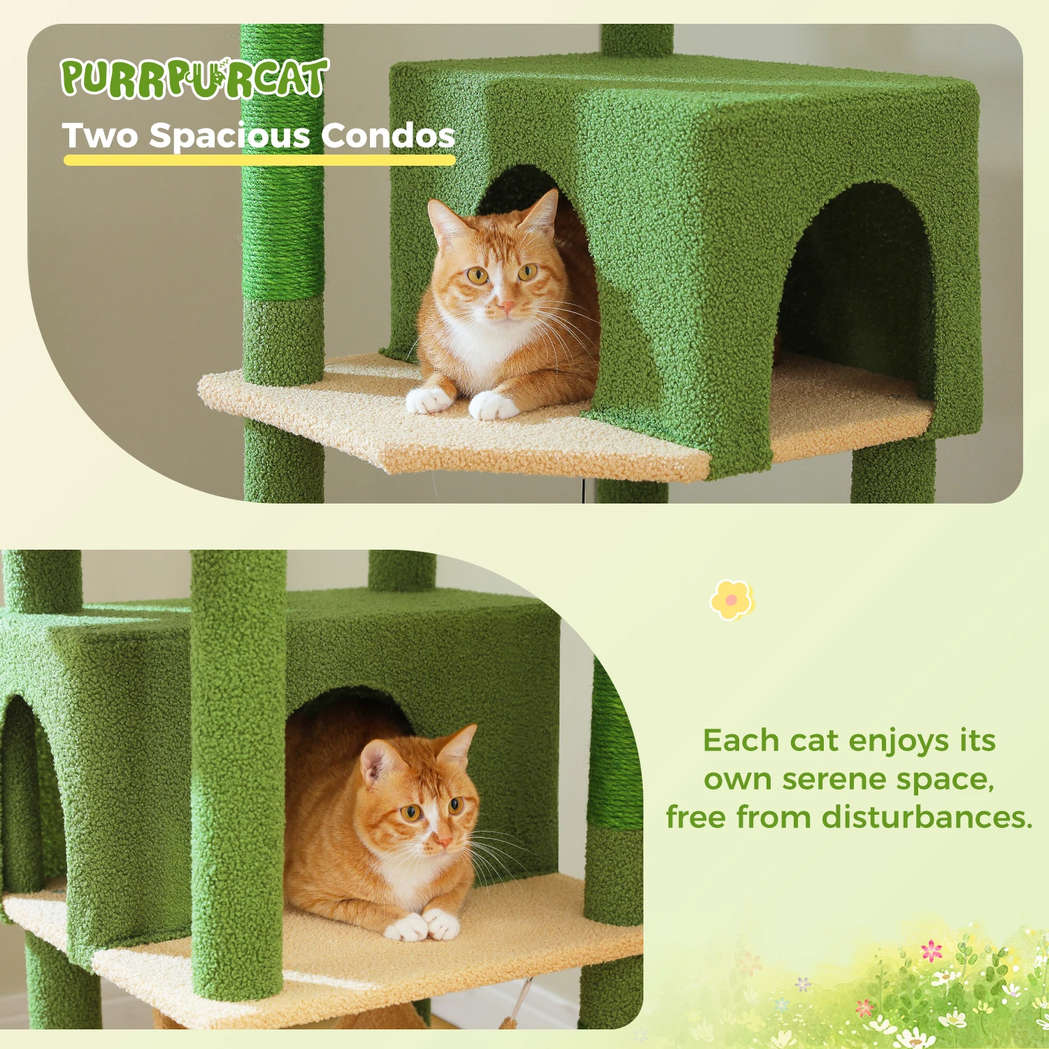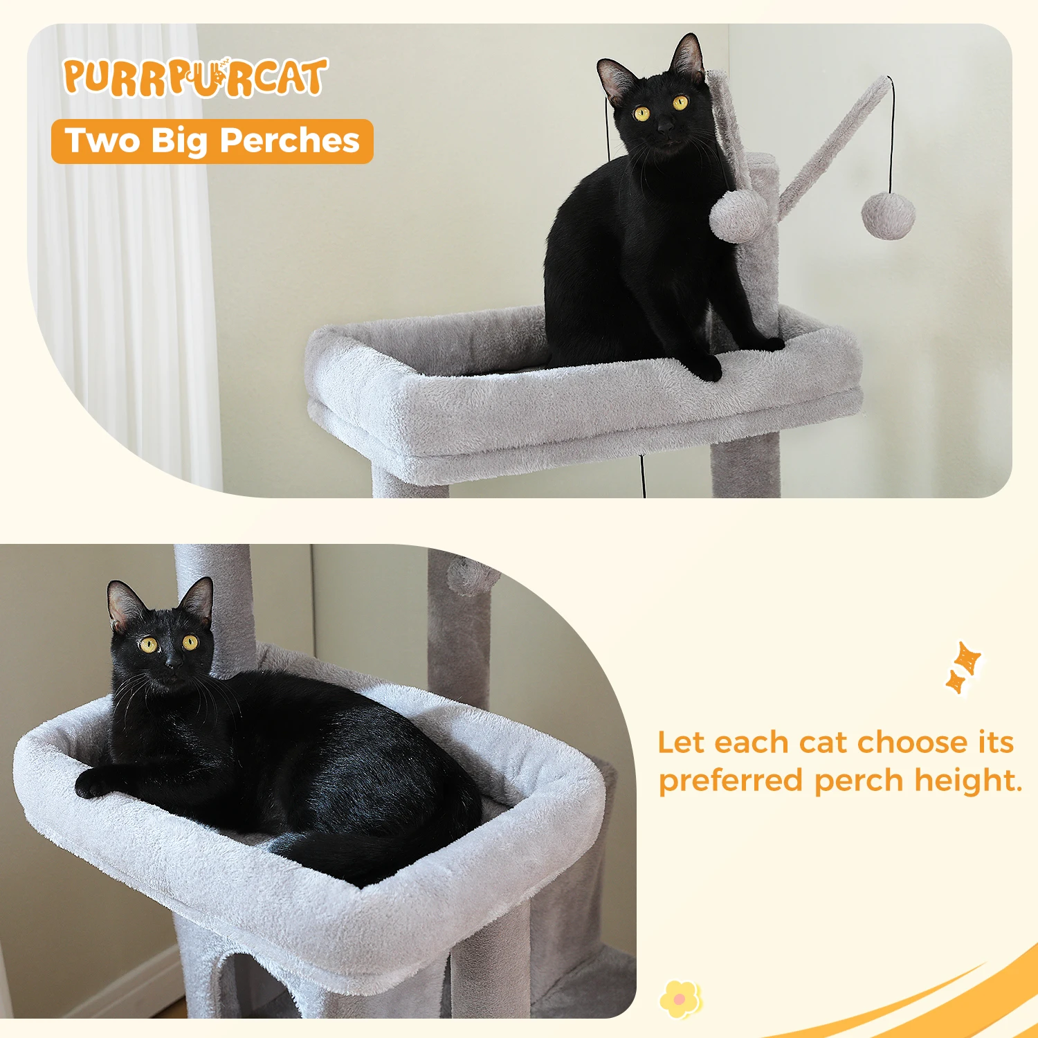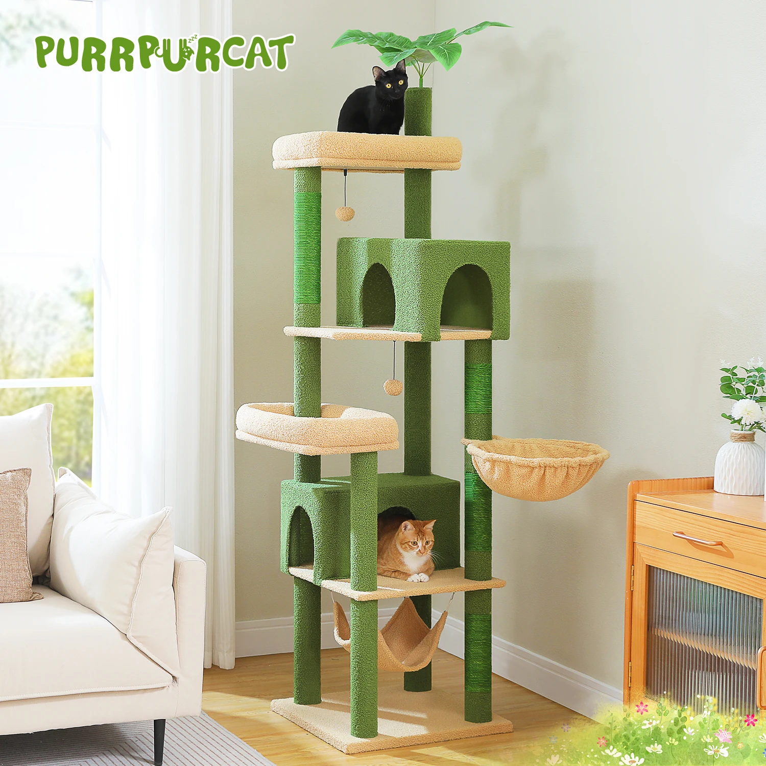 Zonas de confort duales (2 perchas grandes + hamacas acogedoras)– Ofrece diversas opciones de descanso: los gatos pueden acurrucarse en los espaciosos percheros para tomar el sol o relajarse en las hamacas blandas, satisfaciendo su necesidad de lugares de descanso cómodos.