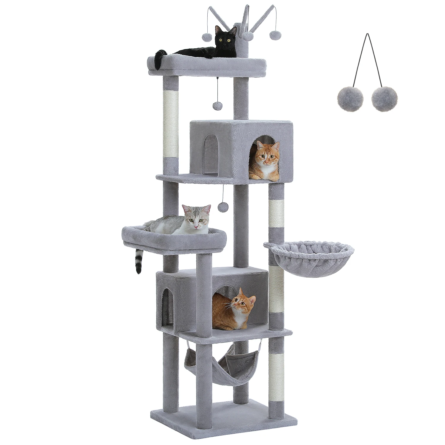 Árbol para gatos grande de 190 cm, torre para gatos de 6 niveles con 2 perchas grandes, hamacas acogedoras, cuerda de sisal natural, 2 condos para gatos, pompones para gatos de interior