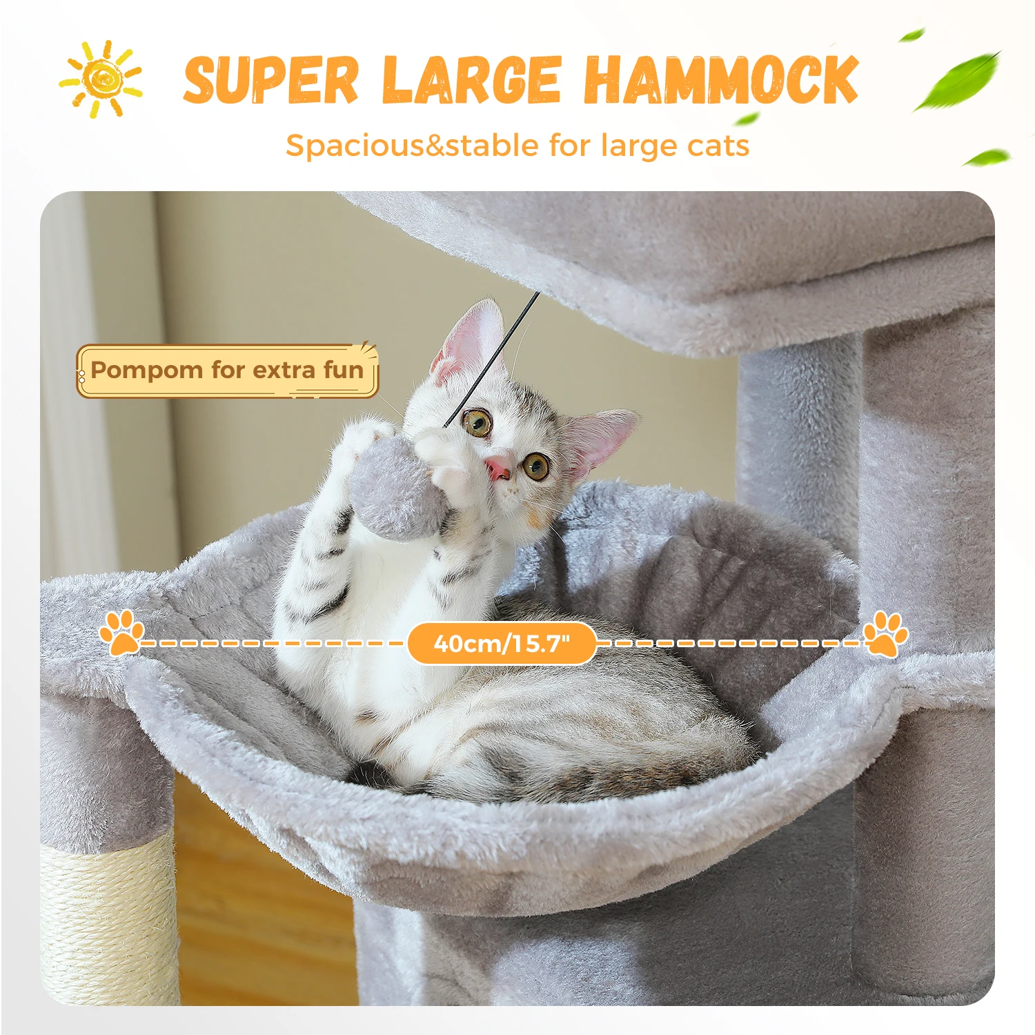 ¡Para gatos grandes!: La hamaca de 15,7" es mucho más grande que las normales.Fijado por 2 postes gruesos, es más estable y seguro para que los gatos jueguen o tomen una siesta.La percha elevada cubierta de felpa con borde elevado ofrece la máxima comodidad y un fuerte apoyo para el amigo felino.¡Y los postes y almohadillas envueltos de sisal satisfarán completamente su instinto de rayones y mantendrán sus garras alejadas de sus costosos muebles!