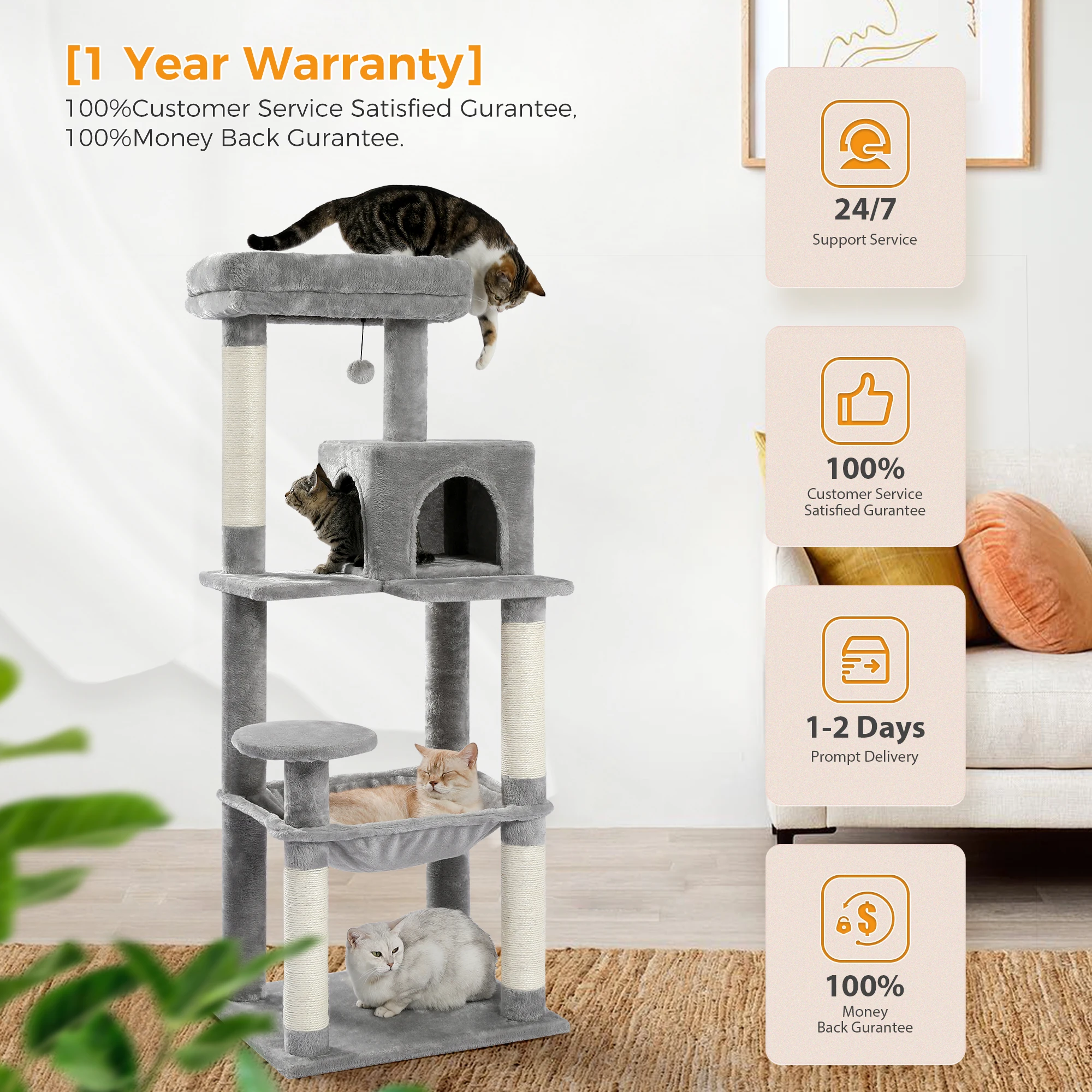 Calidad confiable:La estabilidad y la seguridad son siempre los puntos clave.Confeccionado con tela de felpa suave, tableros de partículas naturales certificados CARB, postes firmes envueltos de sisal y base reforzada, es resistente y seguro para que los gatos gordos y pesados reboten y disfruten en su castillo con facilidad.