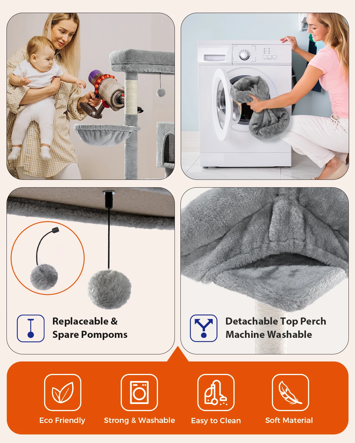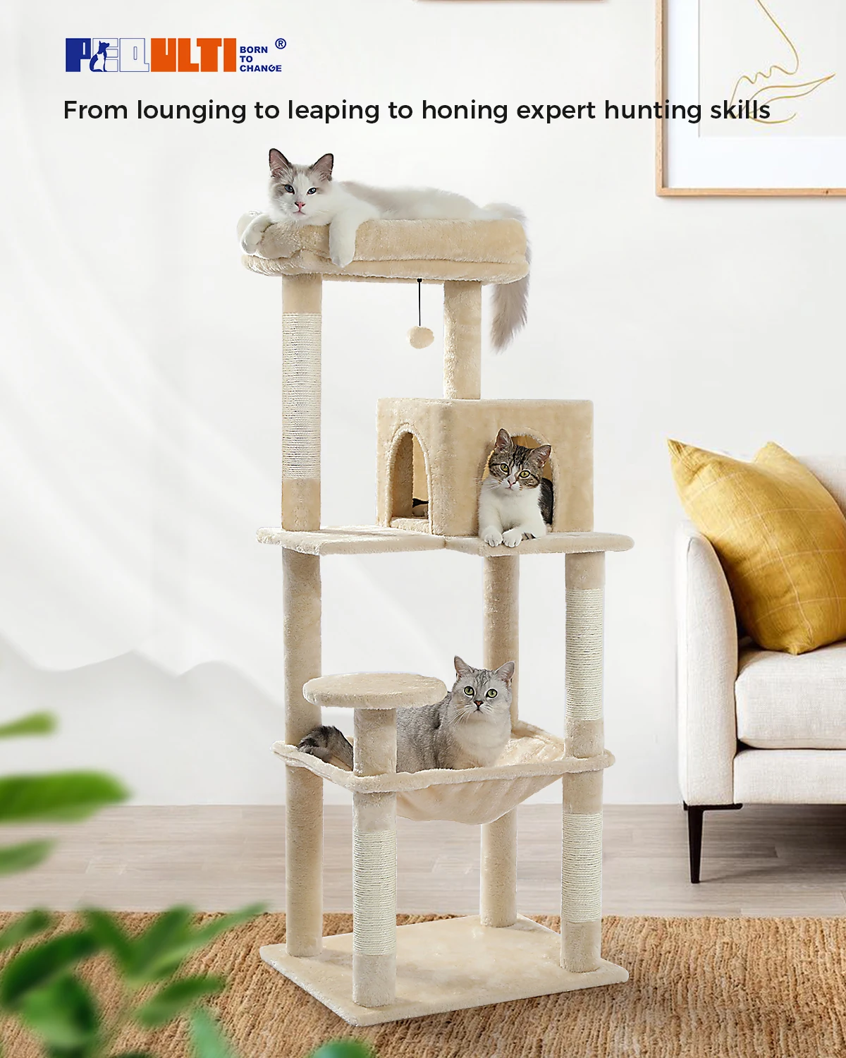 Casa de actividades definitiva: equipado con un condominio espacioso, una hamaca espaciosa, una acogedora percha superior de felpa, postes rascadores cubiertos de sisal natural y una pelota colgante esponjosa, este árbol para gatos de 56,3 pulgadas es un lugar ideal para entretenerse y descansar bien.Tus gatitos alegres podrían saltar hacia arriba y hacia abajo fácilmente con la ayuda del pedal redondo y el diseño de paso.